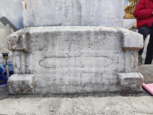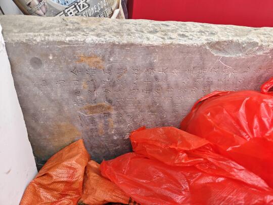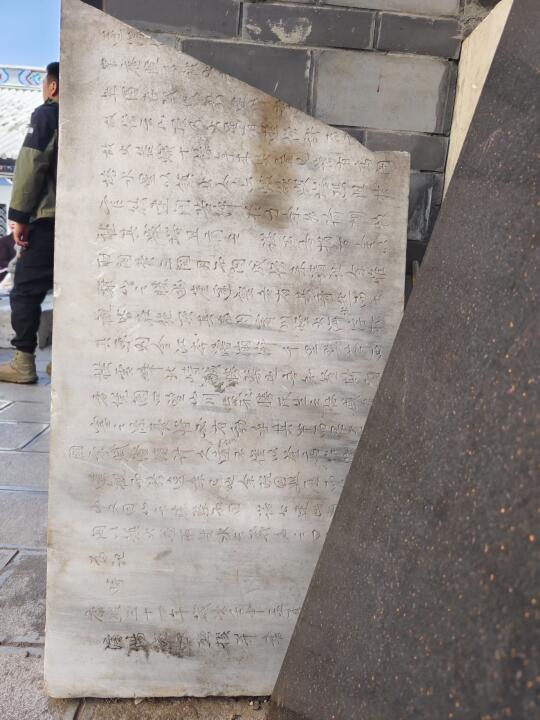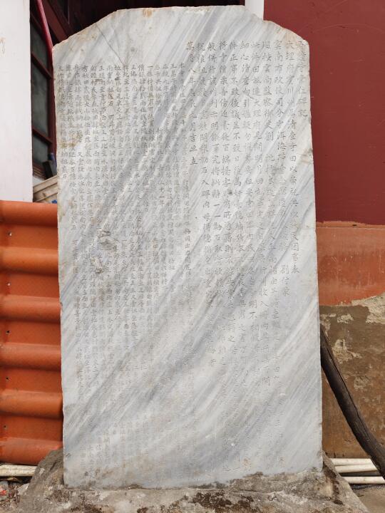 [一R]石钟寺。这是下观光车第一站,寺容令人大跌眼镜,几个破铁棚子一搭,就是鼎鼎大名的石钟寺[石化R]厢房角落里尚存两块石碑,立着的是万历八年《石钟寺常住碑记》,漂亮的大理石,另一块倒着,被杂物掩埋(图2、3)