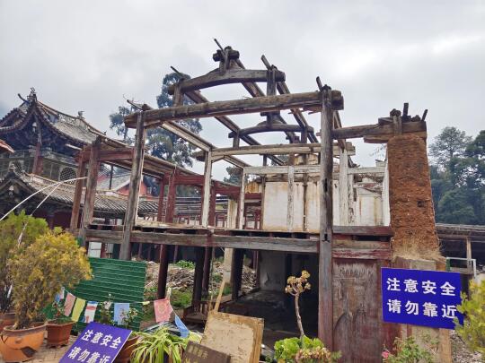 [二R]祝圣寺。山中唯一古建筑为主的寺院,正在大修,两侧厢房露着屋架,结构清晰(图4、5),大殿后面几栋新建的木构建筑,已经上了梁,裹着红布。