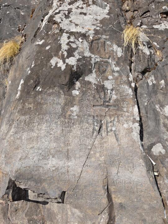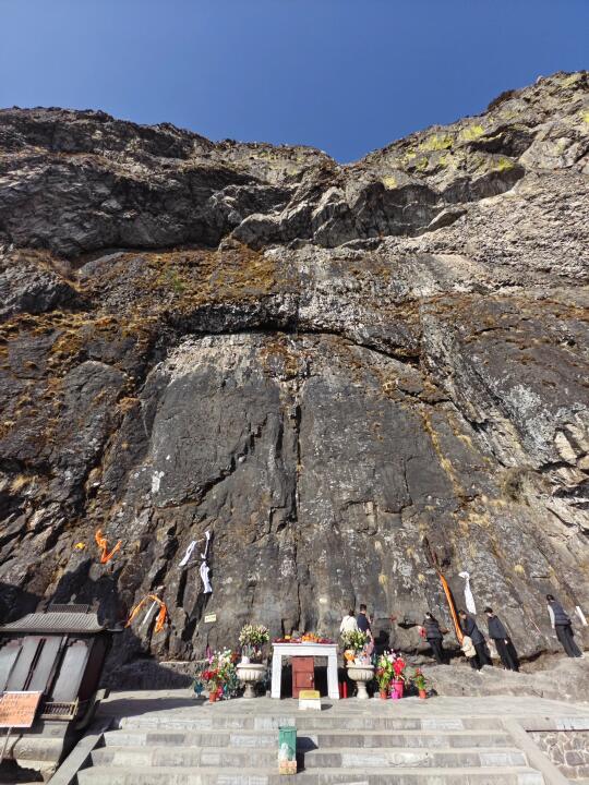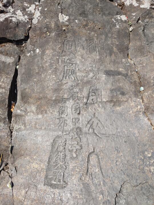 [六R]华首门。崖壁上天然形成一块几十米高的凹陷,中间还有一道缝,正如一扇巨型大门(图7、8)。门扉上两处民国题刻,一为“大同之门”,一为“迦叶守衣入定处”,下面还叠压了更早的行书题刻(图9、10)。