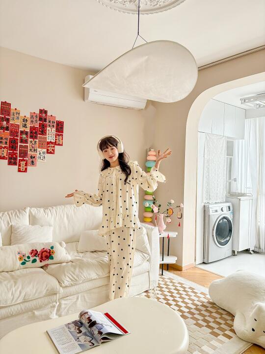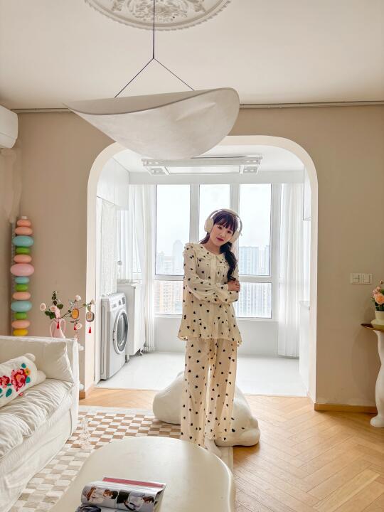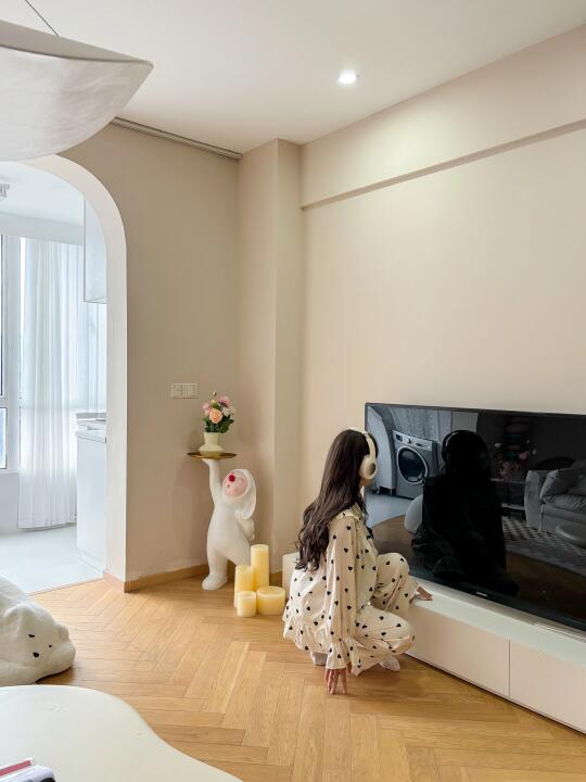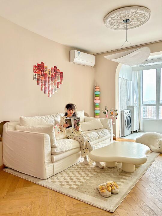 地板是浅木色,家具也都是低饱和度的奶咖、米白、粉色