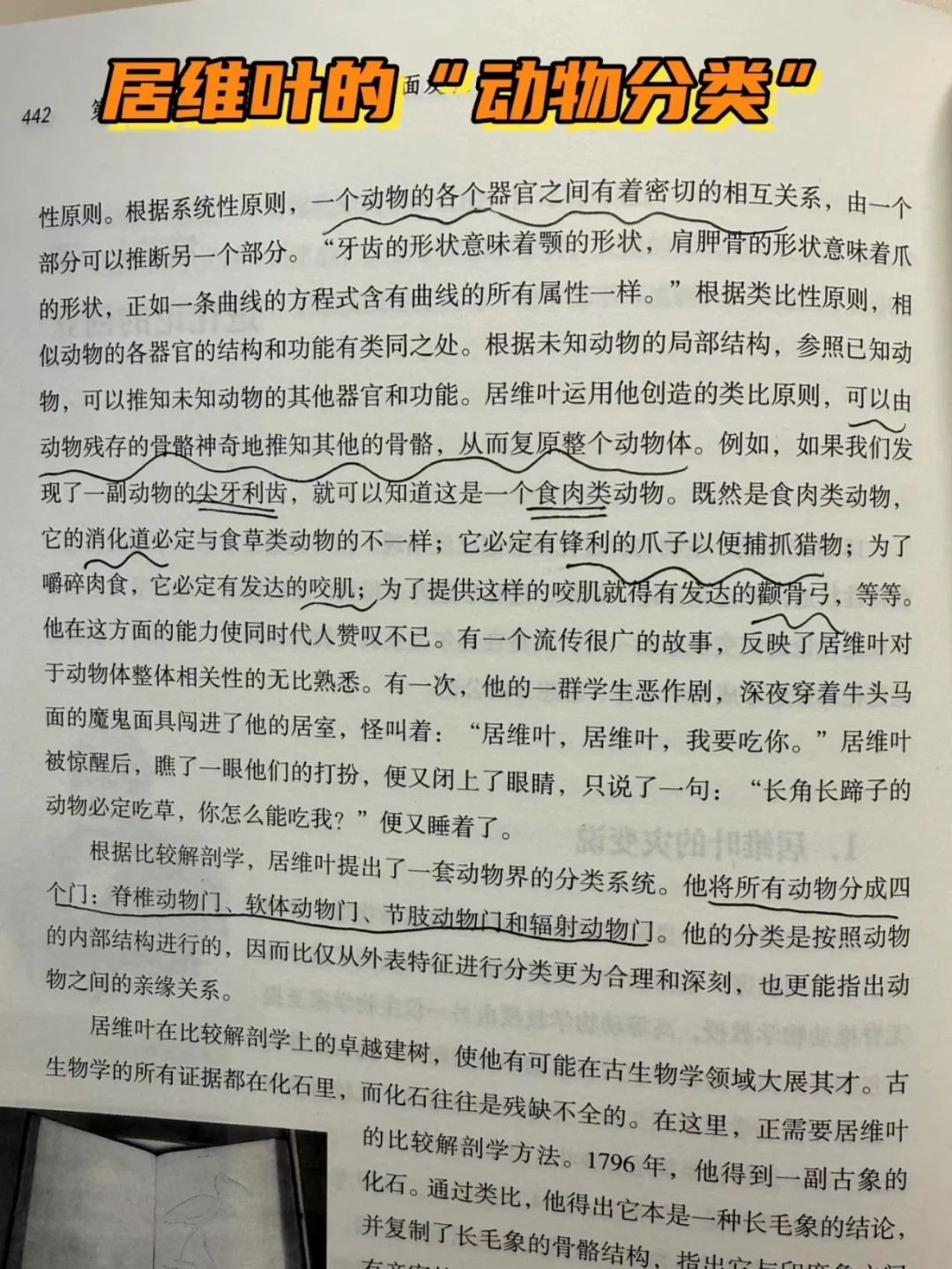 📖想到之前看书,居维叶“能根据动物的一个部位,猜测出它的其他部位”,因为【各个部位相互联系】,就像肉食性动物会有相对应的消化道、爪子、咬肌和颧骨弓,于是就会存在【很像的不同动物】,于是就有居维叶的【动物分类】