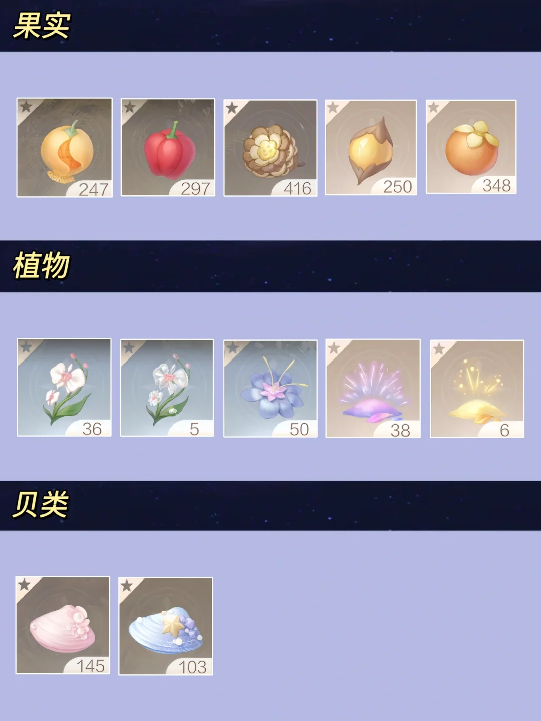 斑斓舒心香薰瓶所需材料 ✅微风绿野比较常见的果实 ✅贝类 ✅只在特定天气或者特定时间段才会盛开的植物/这类植物的花粉 --------------- 五种染色材料配方 1️⃣黄色(12果实) 2️⃣绿色(12植物) 3️⃣粉色(12贝类) 4️⃣棕色(4果实+4植物+4贝类) 5️⃣蓝色(6果实+6植物/6果实+贝类/6贝类+6植物)