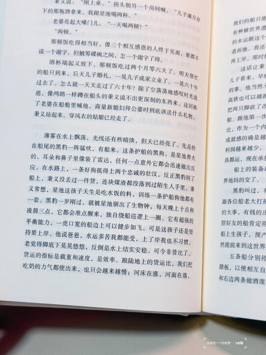 “夜幕垂帘,天似穹庐,夜空蓝黑,星星明亮;人声沉入水底,涛声跃出河面,耳边是运河水拍打船舷的轻柔之声,以及船只晃动时木头榫枘挤压摩擦的细碎吱嘎声。偶尔有人咳嗽,早睡的人打起第一声呼噜,说第声梦话。有人惊呼某个宝贝东西落水里了。有人偷偷摸摸地往运河里撒尿。这就是烟火人生。