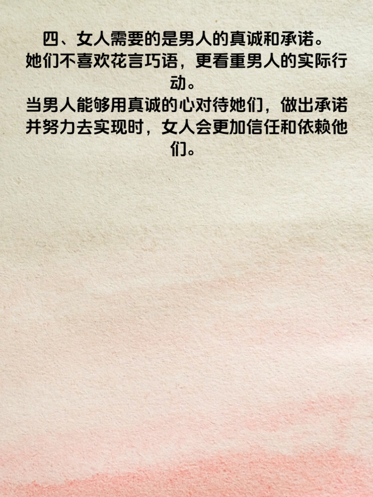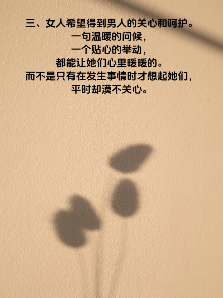 一、女人往往需要的是陪伴,而不是物质的堆砌。在忙碌的生活中,她们更渴望有一个人能时刻在身边,分享喜怒哀乐。然而,很多男人却误以为送昂贵的礼物就能满足女人的需求,却忽略了她们内心对陪伴的渴望。 二、女人需要的是理解和尊重。她们有自己的想法和感受,不希望被男人随意否定或忽视。当男人能够用心去倾听她们的心声,理解她们的难处,给予她们足够的尊重时,女人会感受到被关爱和重视。 三、女人希望得到男人的关心和呵护。一句温暖的问候,一个贴心的举动,都能让她们心里暖暖的。而不是只有在发生事情时才想起她们,平时却漠不关心。 四、女人需要的是男人的真诚和承诺。她们不喜欢花言巧语,更看重男人的实际行动。当男人能够用真诚的心对待她们,做出承诺并努力去实现时,女人会更加信任和依赖他们。