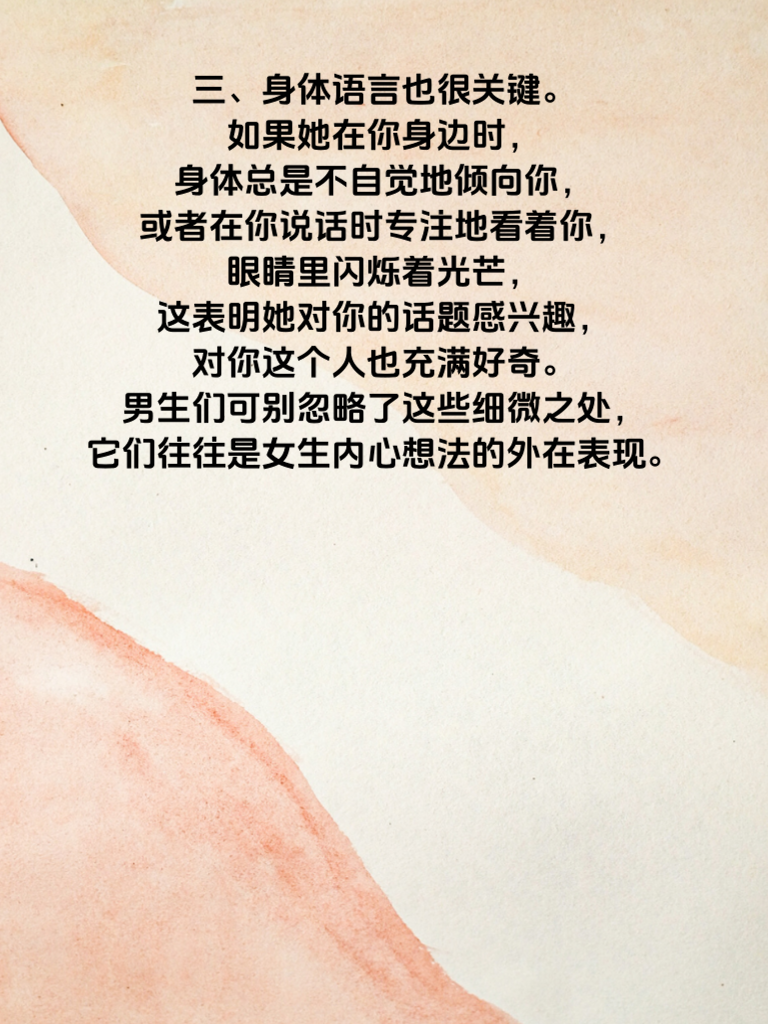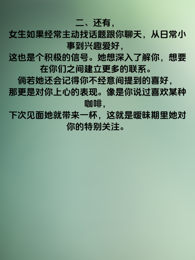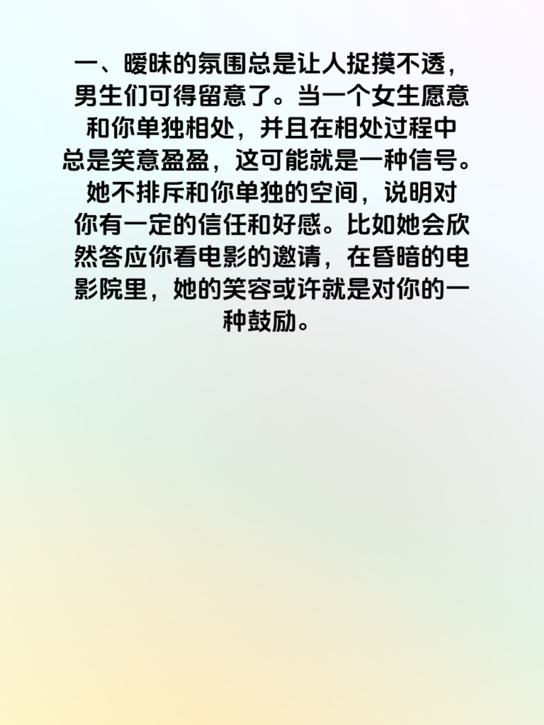 一、暧昧的氛围总是让人捉摸不透,男生们可得留意了。当一个女生愿意和你单独相处,并且在相处过程中总是笑意盈盈,这可能就是一种信号。她不排斥和你单独的空间,说明对你有一定的信任和好感。比如她会欣然答应你看电影的邀请,在昏暗的电影院里,她的笑容或许就是对你的一种鼓励。 二、还有,女生如果经常主动找话题跟你聊天,从日常小事到兴趣爱好,这也是个积极的信号。她想深入了解你,想要在你们之间建立更多的联系。倘若她还会记得你不经意间提到的喜好,那更是对你上心的表现。像是你说过喜欢某种咖啡,下次见面她就带来一杯,这就是暧昧期里她对你的特别关注。 三、身体语言也很关键。如果她在你身边时,身体总是不自觉地倾向你,或者在你说话时专注地看着你,眼睛里闪烁着光芒,这表明她对你的话题感兴趣,对你这个人也充满好奇。男生们可别忽略了这些细微之处,它们往往是女生内心想法的外在表现。