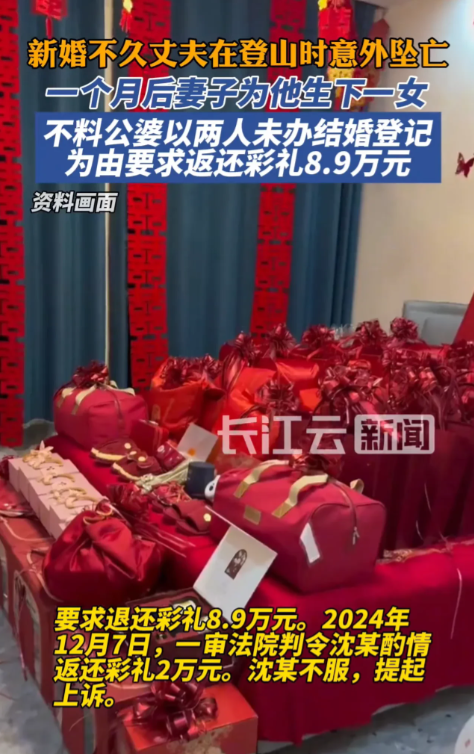 湖北恩施,女子在农村摆酒结婚半年后,丈夫意外身亡。次月,育有一女。可女儿出生后,公公婆婆却以未领结婚证为由,要求女子返还8.9万元彩礼。一审法院判决返还2万元。但二审却有不同的意见。