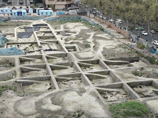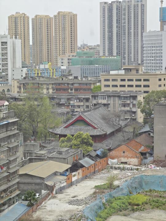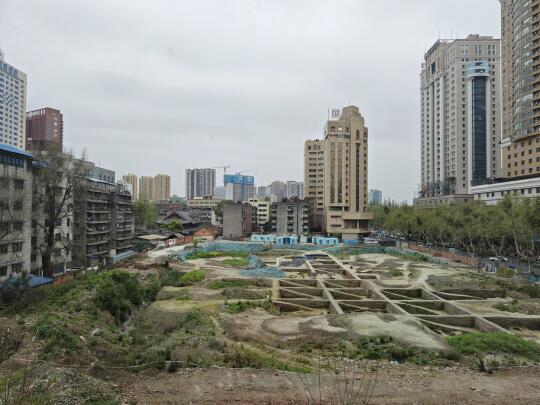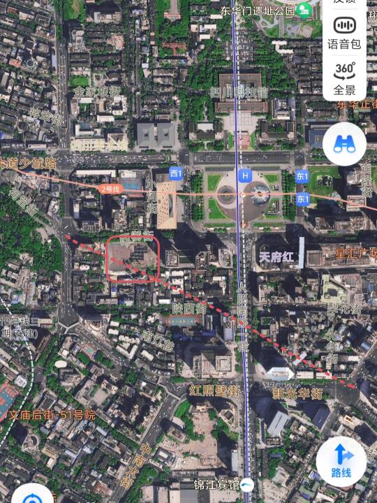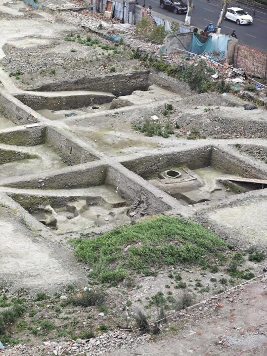 西御街南侧 成都博物馆对面 一个工地里在考古 远处有斜向的铺砖路面 盖着黑布 应该是宋代的街道遗址 就是从祠堂街延伸过来 通往锦兴路的这条 明代修蜀王府 把这一段改成正东西向 修了西御街 城压城路叠路 断了六百多年的路 又连起来了