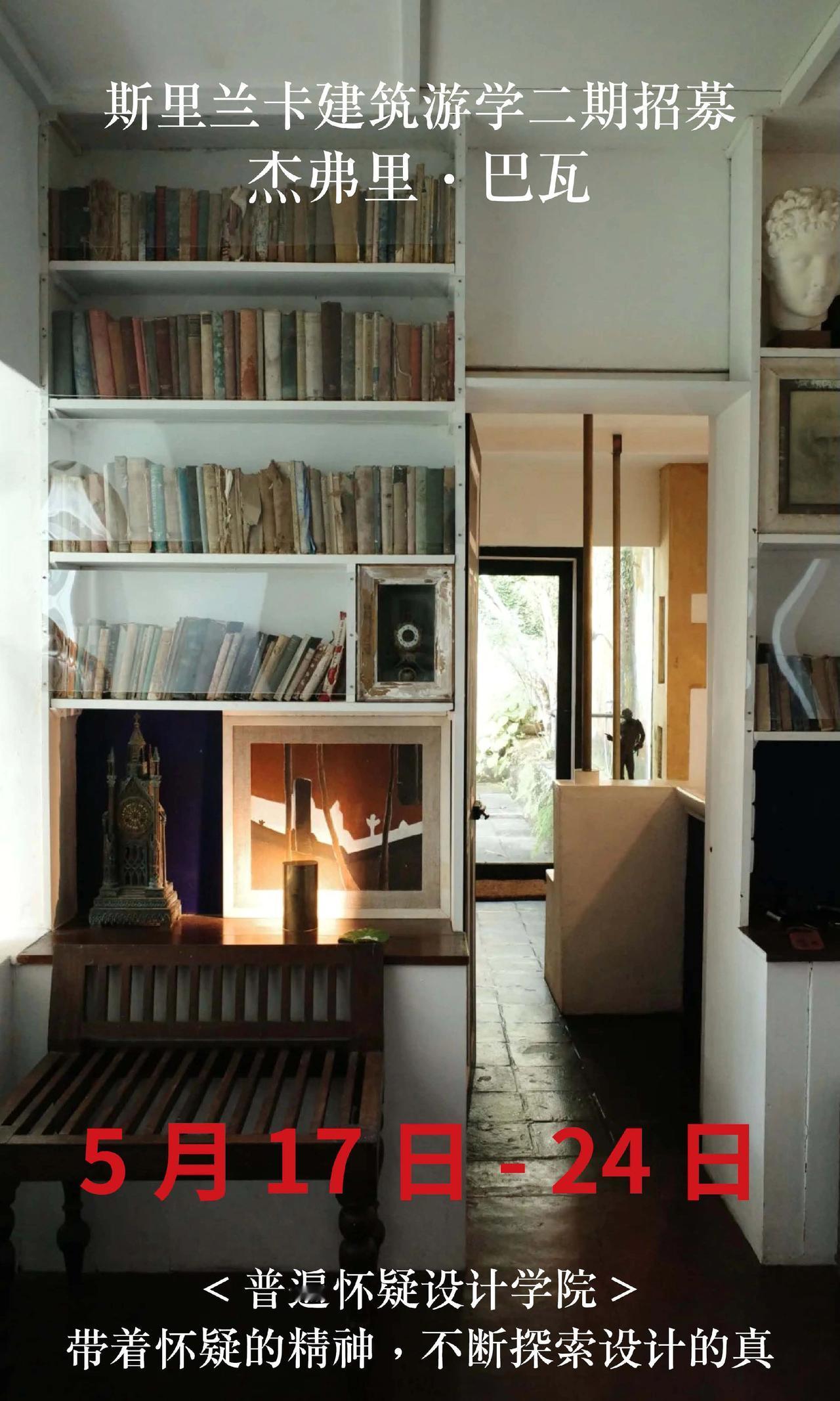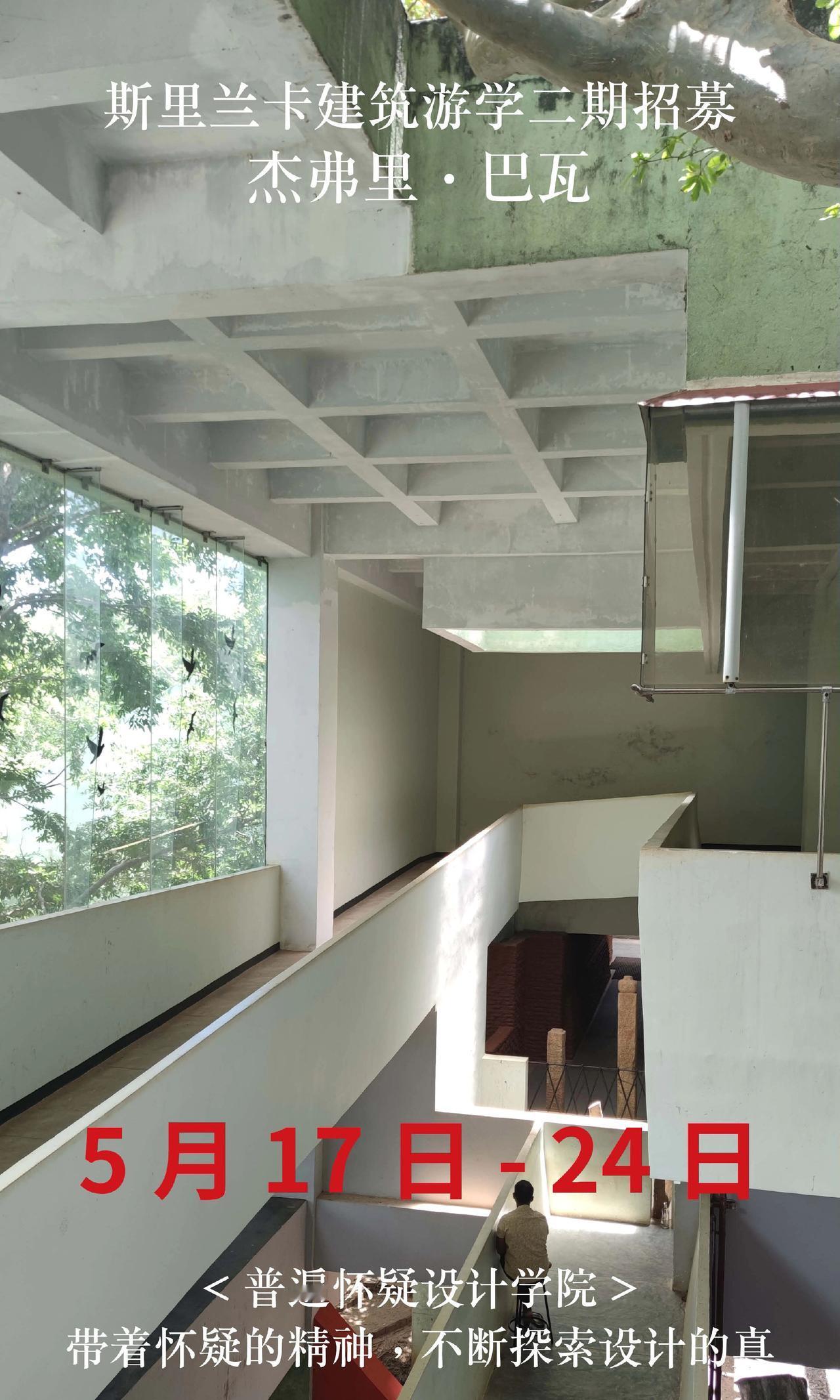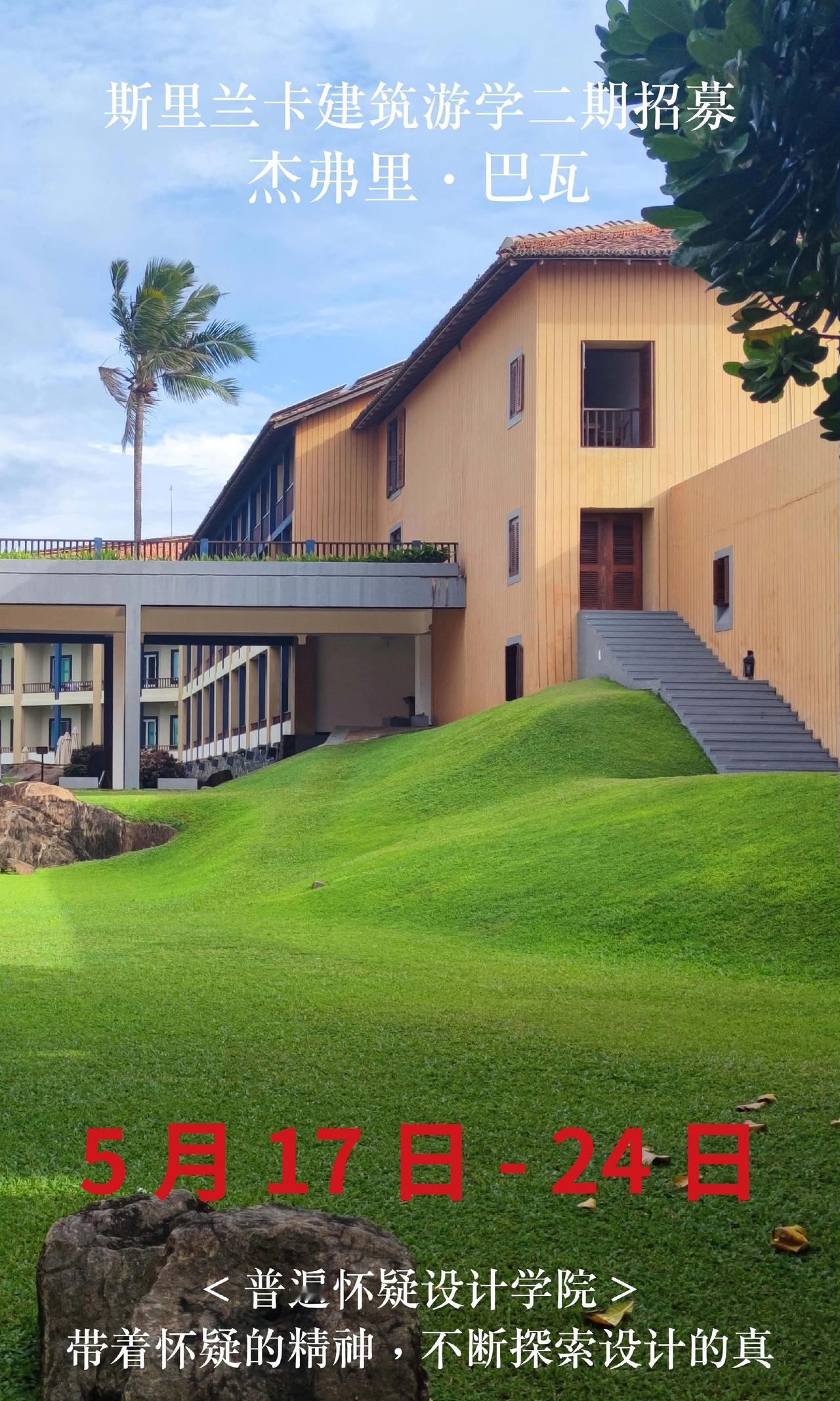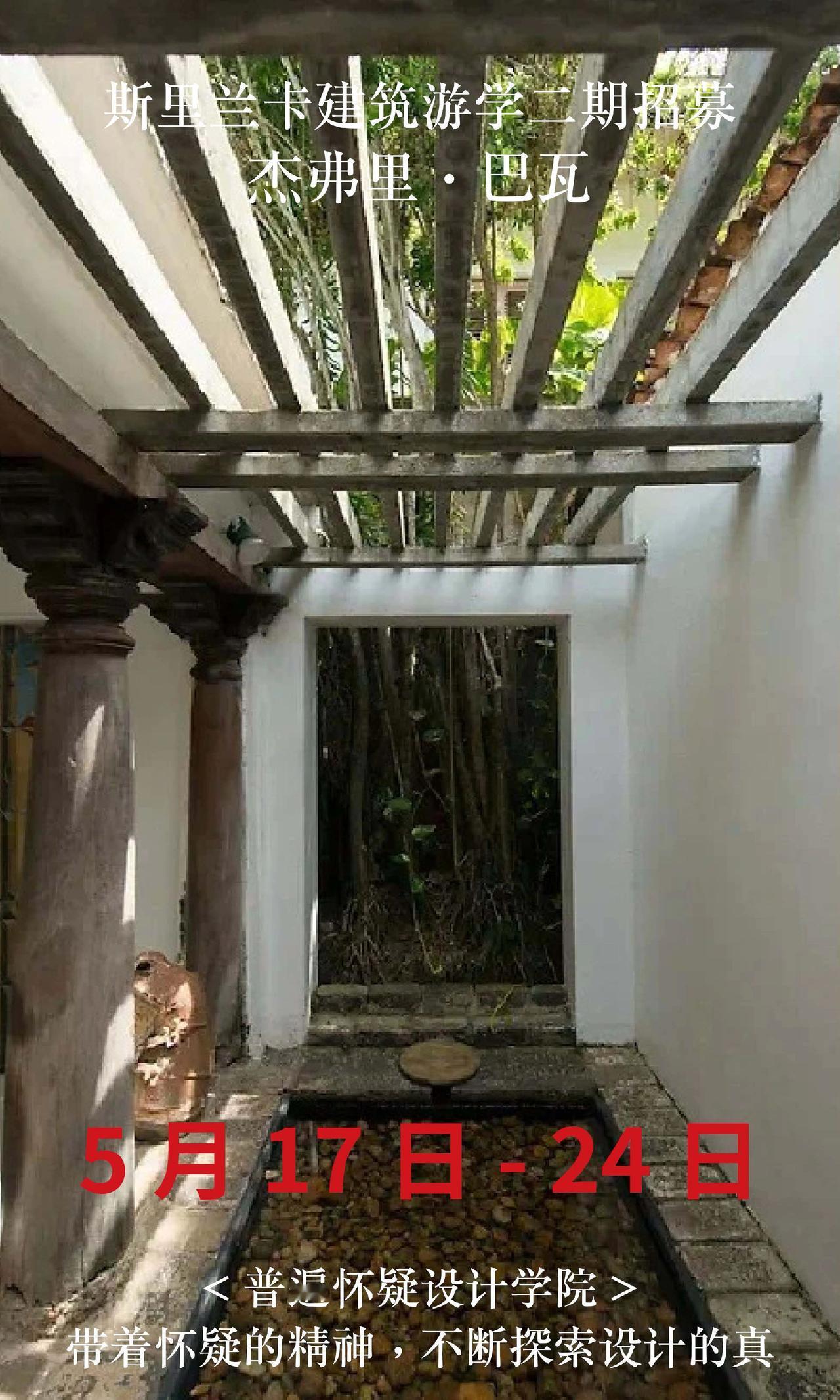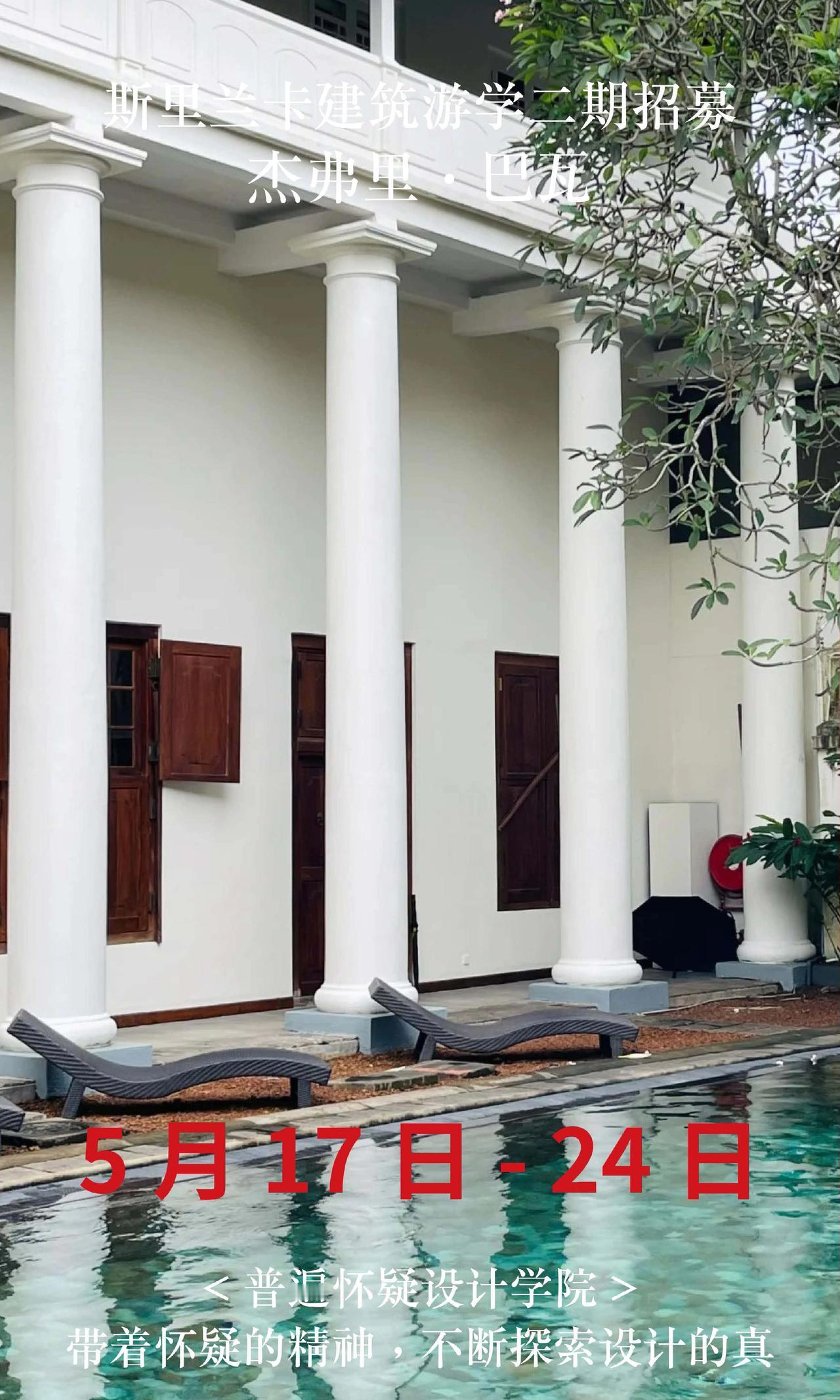 斯里兰卡巴瓦游学二期招募,仅20名额 【出发时间】5月17日-24日 【出发地点】成都往返8天 【报名条件】需要护照,且有效期在半年以上。无需签证。没有护照的朋友尽快办理。 【费用说明】 22500全包价格: 1,斯里兰卡往返经济舱机票 2,星级酒店(6晚巴瓦设计酒店入住体验) 3,星级餐饮(全餐都包,同时额外增加安缦酒店下午茶体验) 4,斯里兰卡境外保险,大巴车费,导游/领队费用 5,20+项目考察门票(尤其包含卢努甘卡室内考察,包含巴瓦套房等,市面多数游学仅在室外参观)。 6,普遍怀疑主理人亲自带队,现场深度内容讲解费用 斯里兰卡 杰弗里巴瓦 设计师游学 室内设计师
