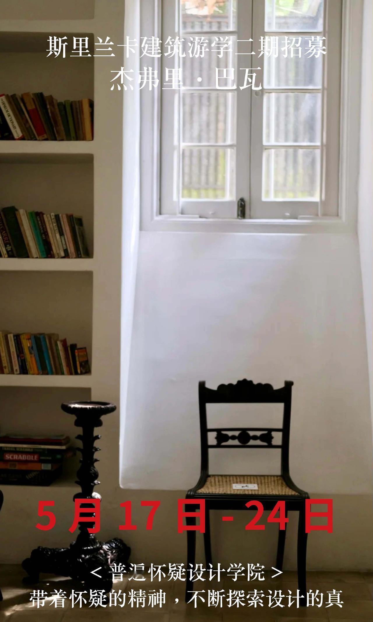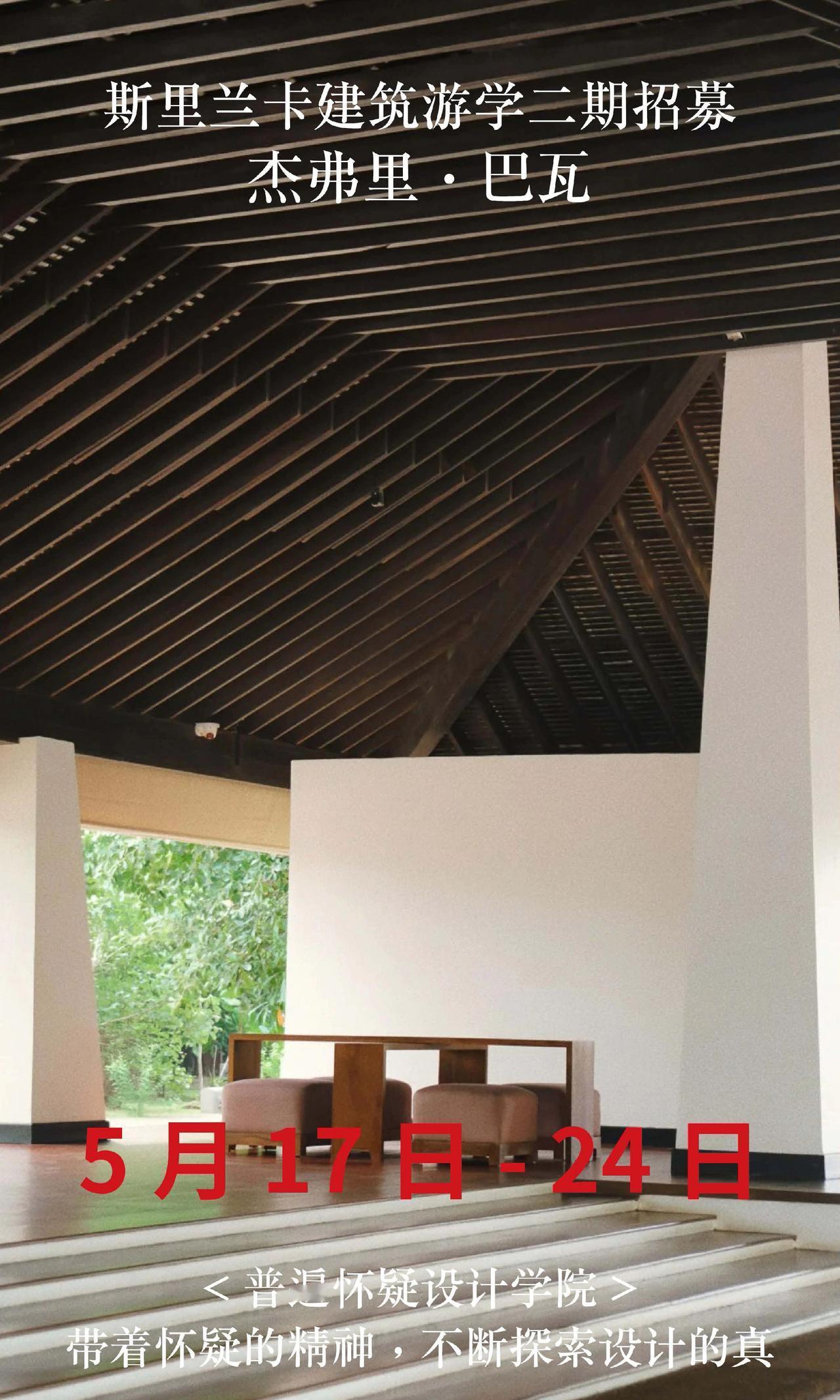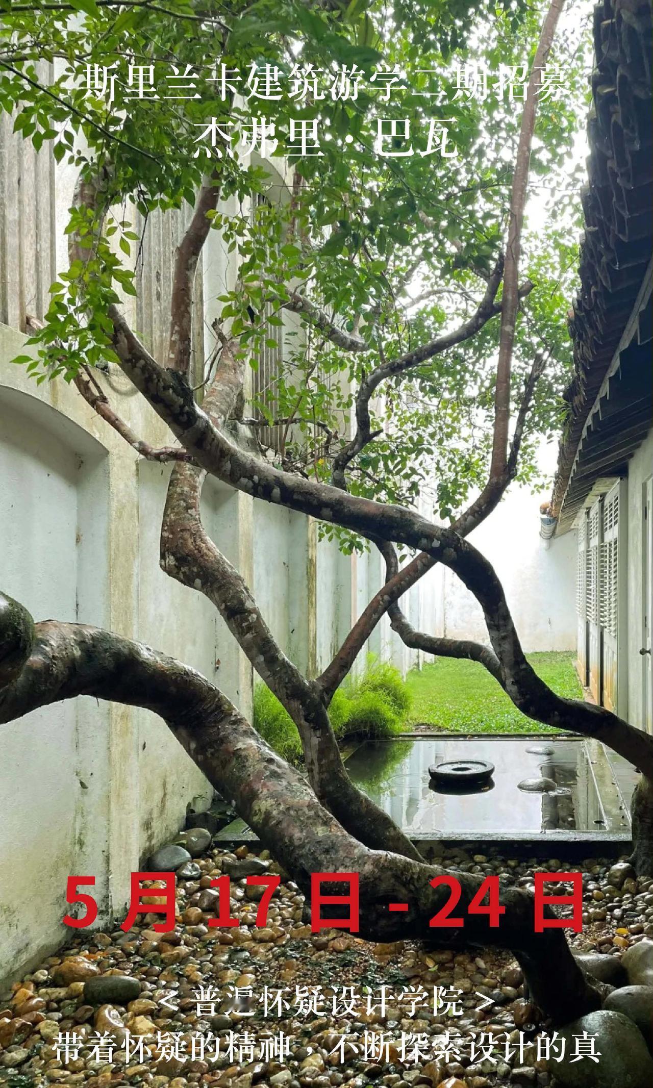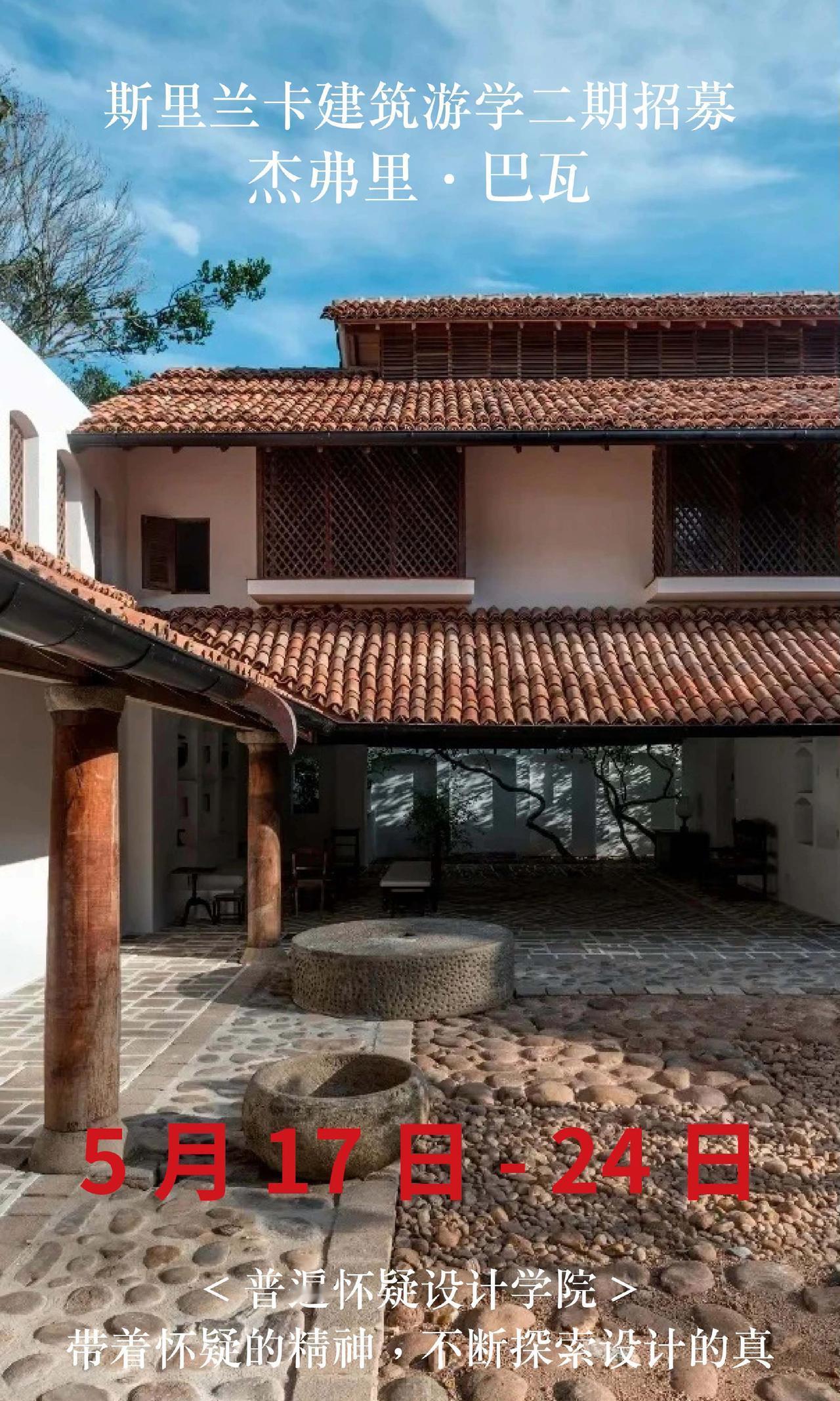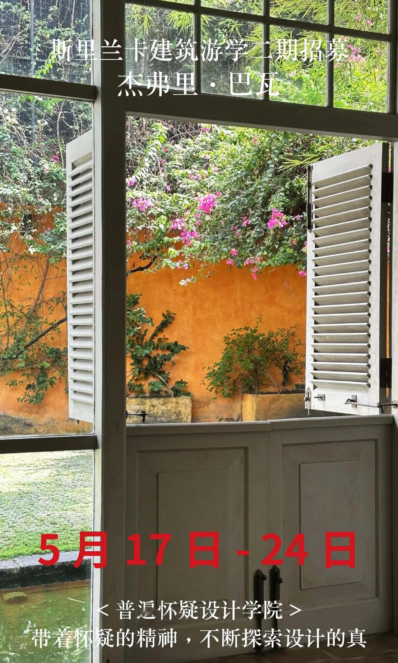 斯里兰卡巴瓦游学二期招募,仅20名额 【出发时间】5月17日-24日 【出发地点】成都往返8天 【报名条件】需要护照,且有效期在半年以上。无需签证。没有护照的朋友尽快办理。 【费用说明】 22500全包价格: 1,斯里兰卡往返经济舱机票 2,星级酒店(6晚巴瓦设计酒店入住体验) 3,星级餐饮(全餐都包,同时额外增加安缦酒店下午茶体验) 4,斯里兰卡境外保险,大巴车费,导游/领队费用 5,20+项目考察门票(尤其包含卢努甘卡室内考察,包含巴瓦套房等,市面多数游学仅在室外参观)。 6,普遍怀疑主理人亲自带队,现场深度内容讲解费用 斯里兰卡 杰弗里巴瓦 设计师游学 室内设计师