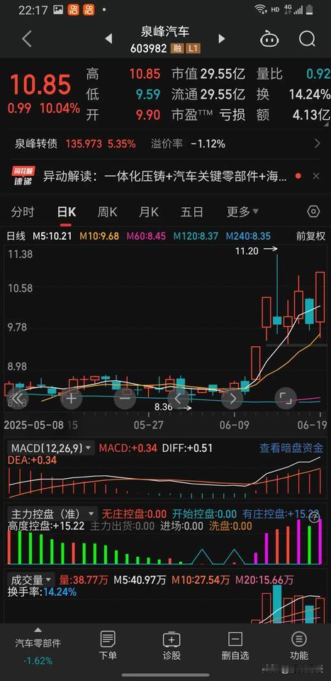泉峰汽车今天涨停了,本来6月11号选股选了这两个,最看好英利两只票底部都有支撑英利汽车能看见高度,所谓底部有支撑上方有高度没有压力,有高度但还是要够得着,3到4个板的高度,太高了没有意义,太低了一涨就是压力位,泉峰汽车二板就是压力位,很可能炸板封不住或许第二天没有溢价,今天泉峰涨停没破前高其实这个涨停不能说明什么问题,记住横盘涨停没意义。