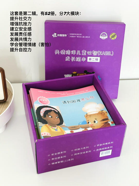 第二辑有52册,分7大模块:提升社交力、增强抗挫力、建立安全感、发展责任感、发展共情力、学会管理情绪(害怕)、提升自控力。