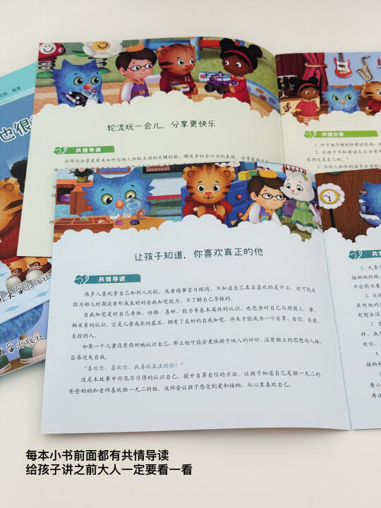 书中没有说教,都是一些很常见的小故事,有超强共情感,每本小书前面都有共情导读,给孩子讲之前大人一定要看一看,而且在讲故事的途中也标记了给父母的指导,特别适合像我一样不知道如何教育孩子的新手父母!