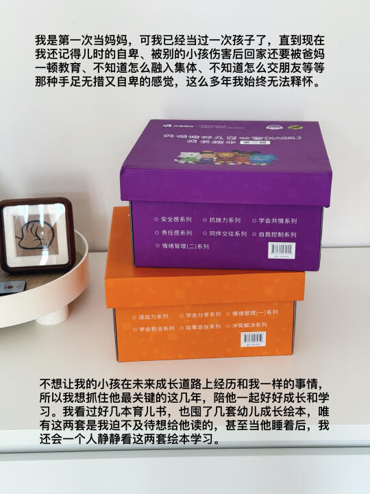 并且我觉得这两套书“育儿又育己”!因为很多育儿难题我自己也不知道到底该怎么做,所以我在看这两套绘本的时候也学到了很多新东西,比如在事情发生的时候,我们不要只关注表面,重要是关注小朋友的内心需求,这样才能对症下药。