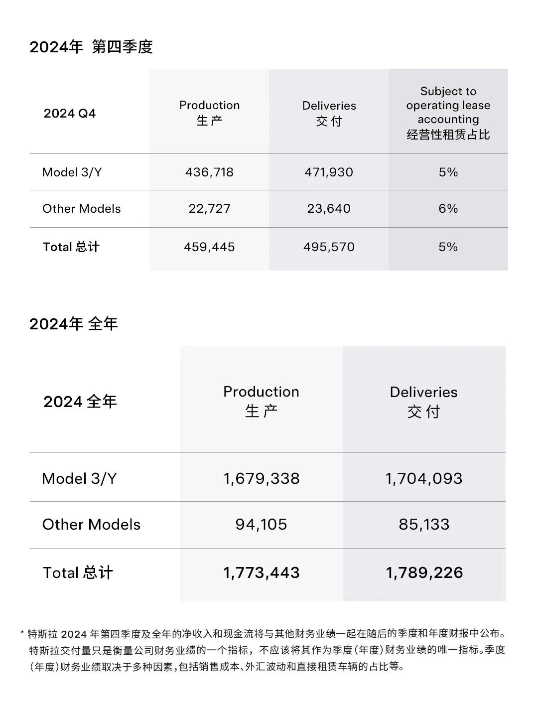 北京时间2025年1月2日,特斯拉发布2024年全球生产与交付报告。数据显示,2024年第四季度,特斯拉生产了大约45.9万辆电动车,交付了超过49.5万辆电动车,并装机了11吉瓦时的能源存储产品——电动车交付量和储能产品装机量达成新纪录。2024年全年,特斯拉全球范围内共计生产纯电动车约177.3万辆,交付约178.9万辆。截至2024年10月,特斯拉全球车主已经超过700万。