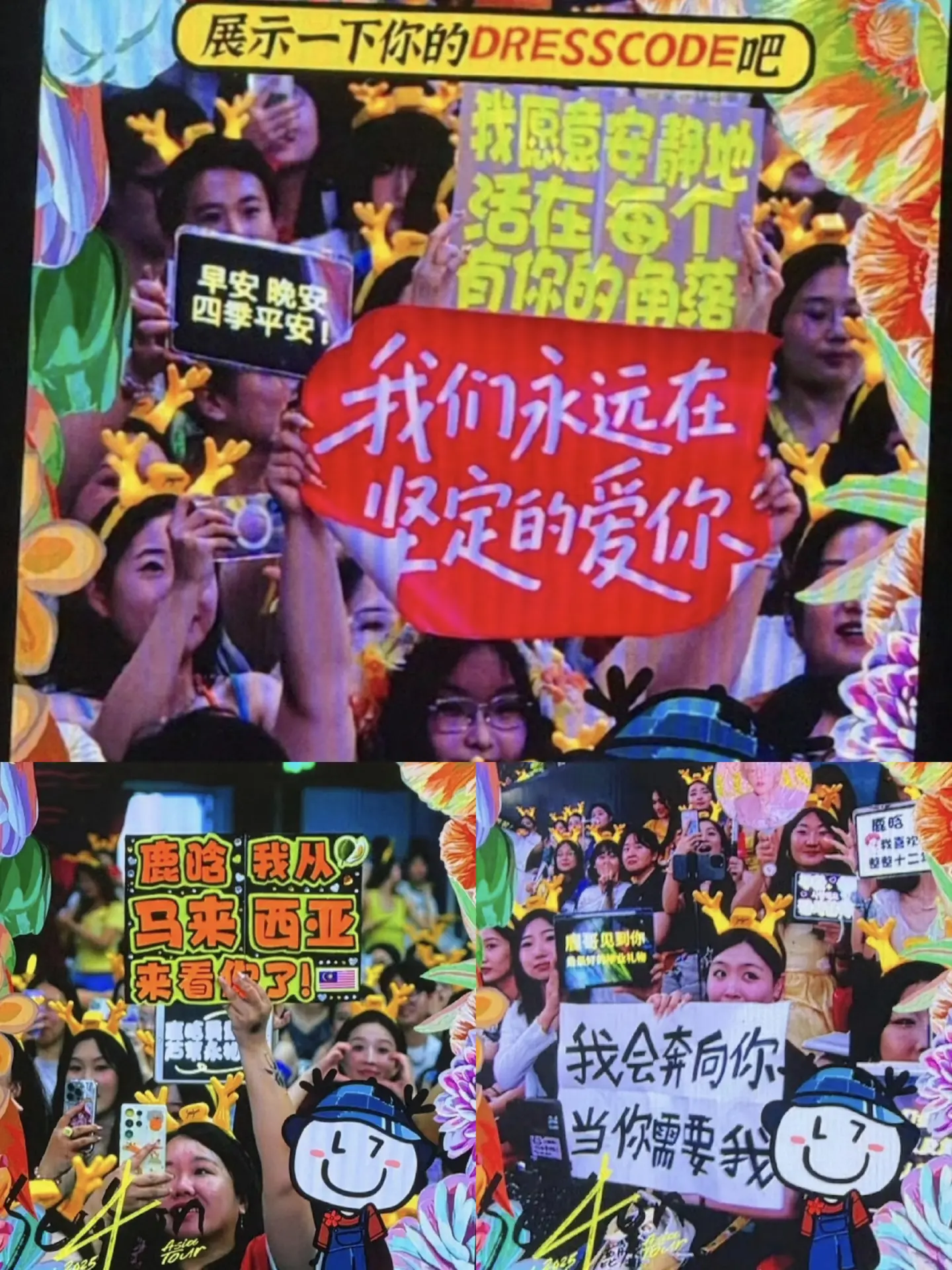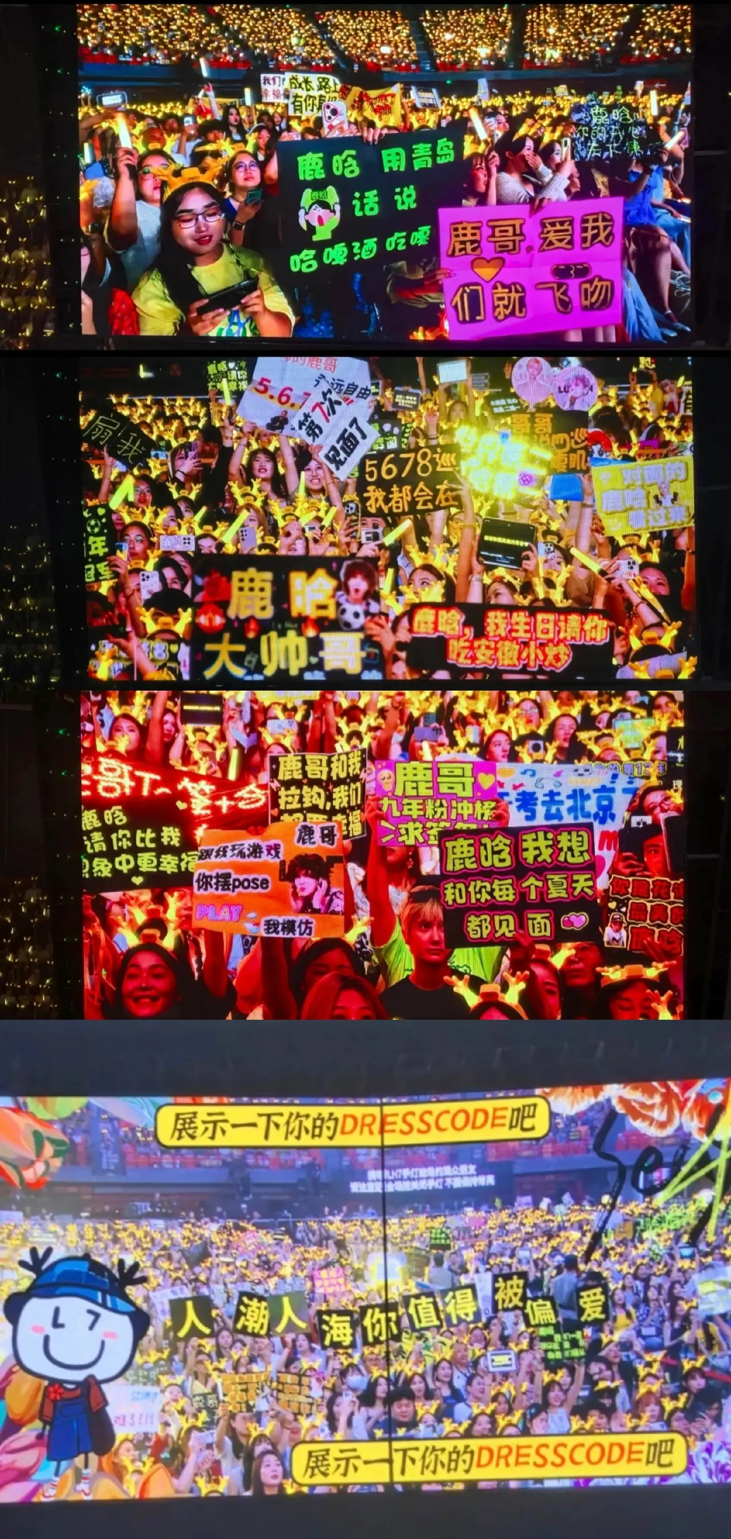 这一刻,时间好像只属于彼此。看着大家四巡的饭撒拍,真的特别特别浪漫,好像大家不再是三巡那个坐在许愿池里的女孩了,不再是为了获得签名而做的牌子,反而这一次,大家只希望鹿晗能够看见自己牌子上写下对他最最最最真诚的祝福!只想热烈对他表达爱意,只想让鹿晗知道我们真的特别特别需要他,让鹿晗坚定做自己,让他知道自己值得!值得一切最好的!值得拥有被偏爱的权利! 鹿晗,你只需要站在那里,所有人都会坚定奔向你