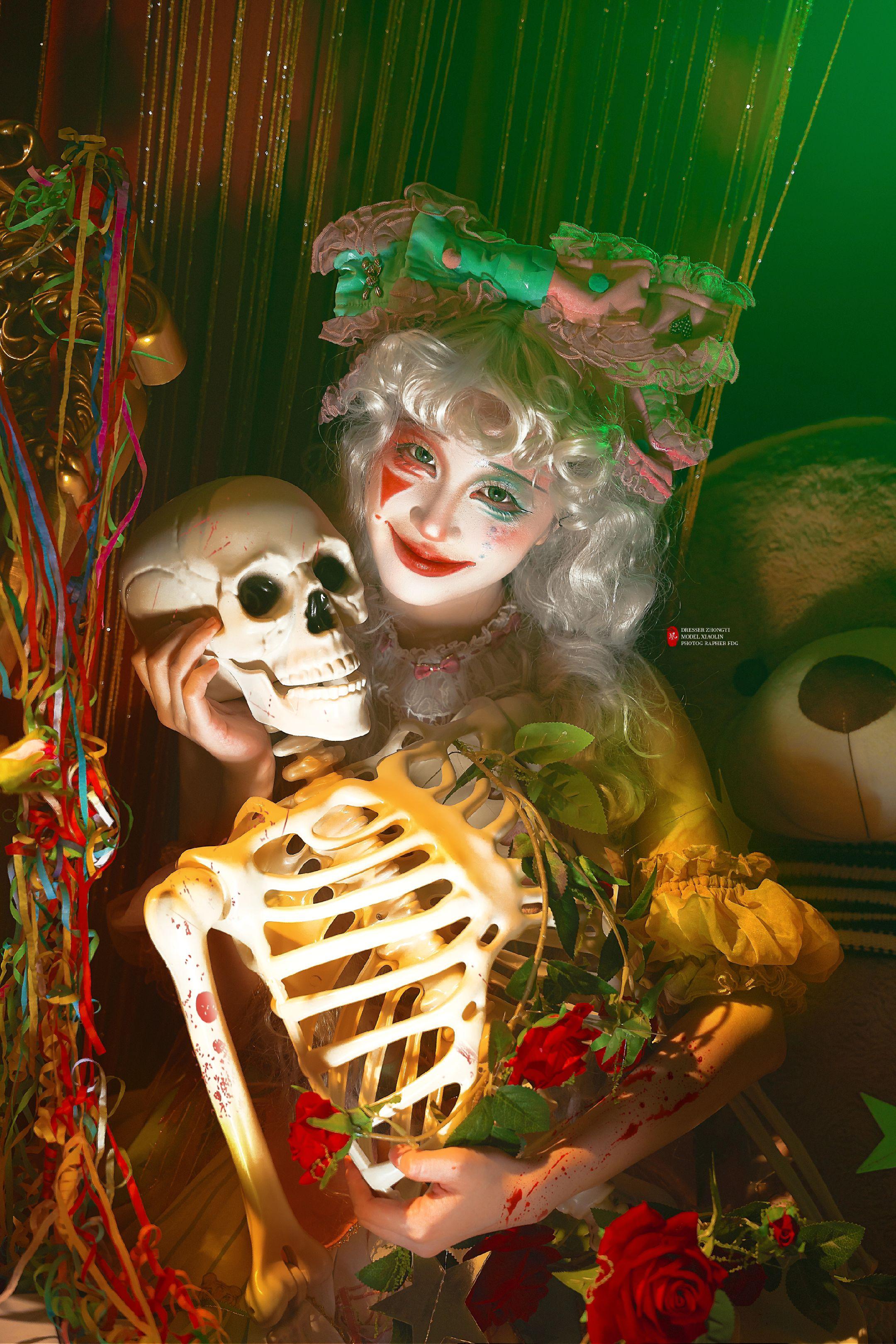 画皮娘子某,本工绘事。尝自描眉黛,铅粉扑额竟生鳞纹,原是爱美妖,胭脂着面即转青