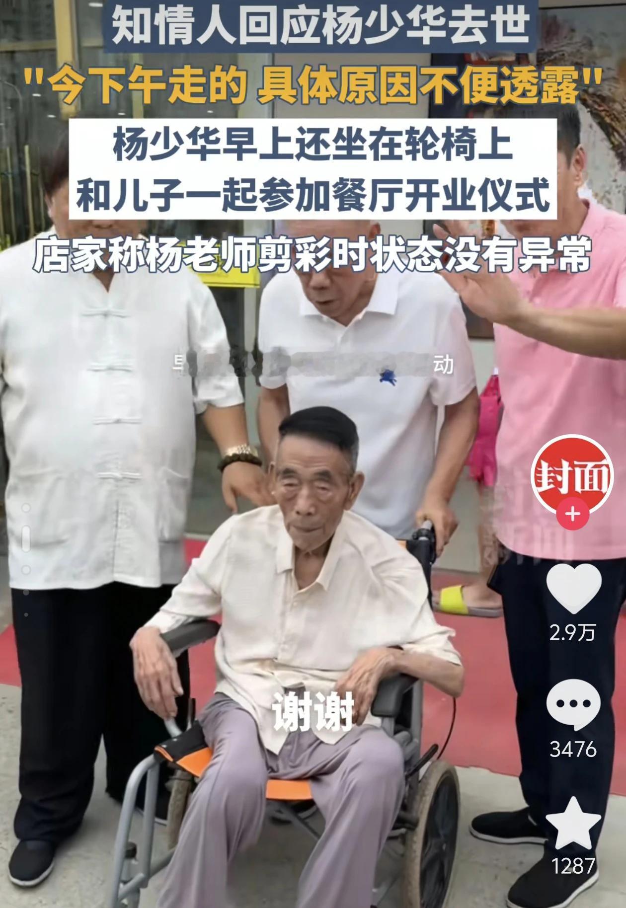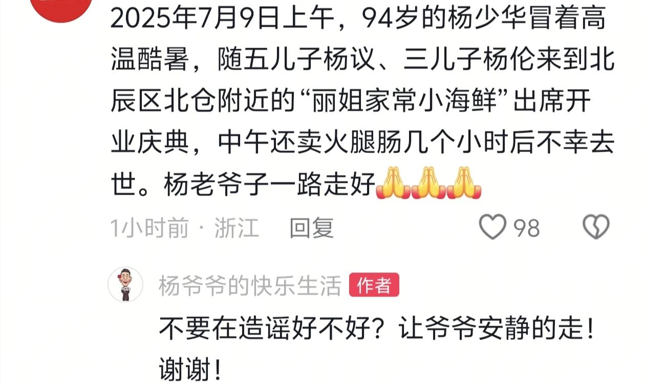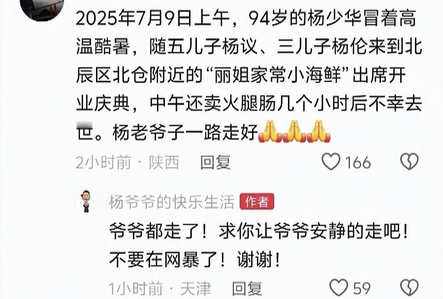 杨少华老爷子走了,怀念!烈日炎炎下还不忘给儿子们挣钱,为了带货吃淀粉肠!那个眼神让人看到心疼,抖音出孝子名不虚传!网友调侃“杨老爷子是第一个热死的相声演员”!“孝子”们需要反思反思自己! 面对网友们的质疑,他们回怼道:“不要网暴他,爷爷都走了”。对此你怎么看?