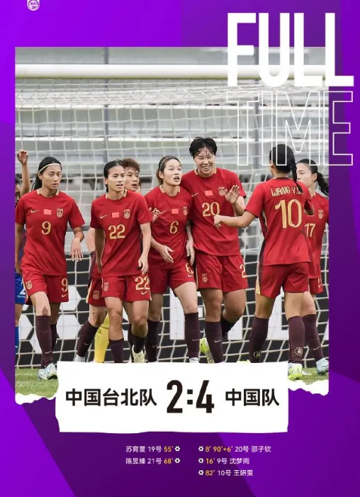 2025年东亚足球锦标赛,中国女足4-2战胜中国台北女足,上半场,邵子钦率先破门,沈梦雨右脚低射扩大比分,下半场,中国台北女足连进两球扳平比分,第82分钟,王妍雯世界波将比分再度超出,补时最后时刻邵子钦头球锁定胜局