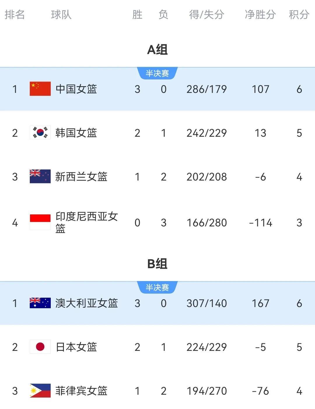女篮亚洲杯赛场赛况趋势 小组赛排名 中国第一晋级决赛 韩国第二决赛资格赛