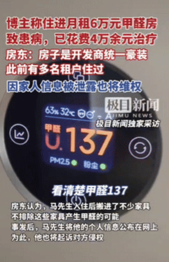 “到底谁对谁错?”浙江杭州,一男子住进月租6万元的房子后,出现咳嗽过敏情况,医药费就花了4万余元,他怀疑房内有甲醛,就让检测机构鉴定,不料,结果显示房子甲醛含量超标近3倍,但房东拒不承认是房子问题,只因男子入住后,搬进了不少家具,不排除是家具产生甲醛的可能,网友:月租6万,为什么不自己买房? 据极目新闻7月18日报道,男子把检测报告交给房东,不管怎么说,屋内甲醛确实超标,这点是不可否认的,但甲醛到底是怎么产生的,还需要进一步鉴定。 男子要求很简单,就是让房东把所有押金给他退还了,可房东就是不正面回应,因为房东认定自家房子没甲醛,原来房子很早就交付了,男子不是他的第一个租户。 在他之前,有不少人居住过,可人家都没出现身体不适,房东购买这套房子的时候,装修全部都交给开发商了,光是这笔费用都花了400万元,材料怎么可能会用差的。 时间都过去那么久了,即便有轻微甲醛,也早就消散完了,男子就是在无理取闹,更何况家具也有产生甲醛的风险,男子为了让自己住的更舒服,添置许多家具。 双方谁都不肯让步,男子将房东起诉至法院,同时他还房东的信息发在网上,使房东不堪其扰,于是决定反诉,目前还没结果。 对于这件事情,大家有什么看法? 信息来源:极目新闻 2025年7月18日