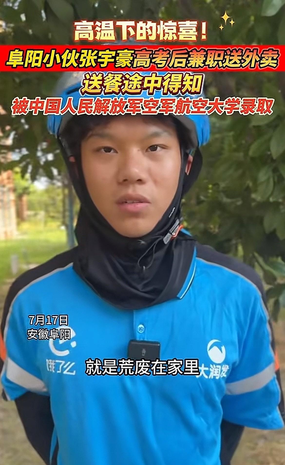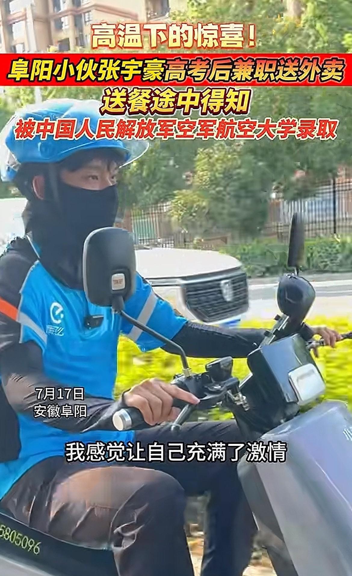 这也太励志了吧?安徽阜阳小伙张宇豪高考后兼职送外卖,烈日下接到的“最美订单”,是中国人民解放军空军航空大学的录取通知书! 这名来自阜阳三中的张宇豪说,他当时正在送一个外卖订单,刚到楼下就接到了年级主任给他发的信息,说他被中国人民解放军空军航空大学录取了,当时他非常的激动,因为这是他送外卖时接到的最美订单了! 关于张宇豪为何高考后,还要在高温天气下送外卖,他是这么说的:“不想这个暑假荒废在家里,不想把时间浪费在手机和游戏上面,非常向往自律的生活!” 高考结束后,能出来送外卖已经很优秀,而且还是在这高温天气下送外卖,不得不说这个男孩真的是太励志了,太优秀了!看到很多网友也是特别关心这个男孩,都是建议他立刻停止送外卖,安心在家锻炼身体等着开学,因为从他接到录取通知书的那一刻开始,身体就不能有任何闪失,送外卖不安全因素太高了,万一磕碰了都是会影响上学的! 不过对于网友们建议,我想这么懂事又自律的孩子,一定也会有自己的想法的,所以大家也是不用担心的! 信息来源:阜阳新闻综合频道