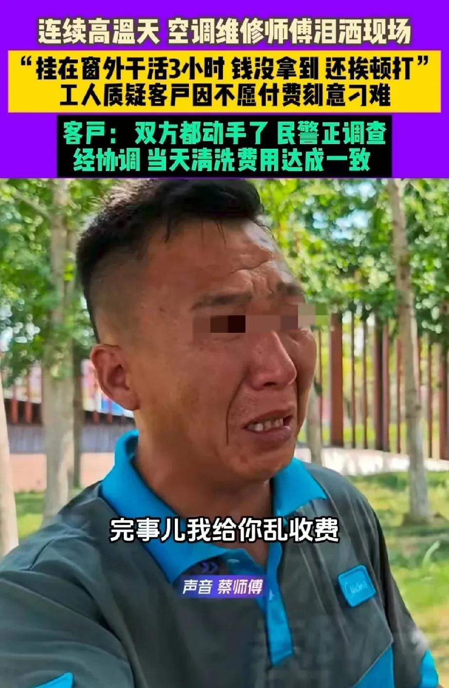 河南周口,酒店负责人反映空调不制冷,经过检查是外机太脏,需要清洗,150元一台。刚开始负责人要求免费清洗,后来酒店另一位女工作人员说愿意花钱洗。维修工上门后,挂在室外,顶着高温,连续工作三小时,清洗了6台空调,谁知刚洗完,酒店负责人就冲过来骂爹骂娘,不但不给钱,还踹了师傅一脚。师傅倍感委屈,潸然泪下。 7月18日,小莉帮忙报道了蔡师傅的委屈,40度的高温天气,自己挂在窗外连续工作三个多小时,1分钱没拿到却还挨了顿打。 蔡师傅是一名空调维修工,十几天前一个酒店的负责人报修,说空调不制冷,维修师傅上门检查,发现是外界环境问题,就是说脏引起的不制冷。 这就要清洗外机,每台收费150元。 用户不同意,要求免费维修,这可把办不到,于是蔡师傅便走了。 结果,对方一直在打电话投诉,没办法,公司又派了两个师傅上门检查,还是同样的故障。 考虑到客户的顾虑,蔡师傅表示我给你免费清一台,看看是不是脏引起的,如果这好了,其他的就要付费。 蔡师傅清理了一台之后,机器果然正常制冷。效果这么明显,但是客户还是不愿意花钱,蔡师傅就只好又走了。 谁知,他回去之后对方又开始投诉,说其他机器还是无法正常运行。 随后,酒店的一位女工作人员联系了蔡师傅的同事,说他们愿意花钱清理,于是蔡师傅和同事马不停蹄赶到酒店是清理。 40多度的天气,他们挂在外墙上干这个实在是受罪,流下的汗水辣的眼睛都疼,但为了挣钱也没办法。 清理了三个多小时,终于清完了六台机器。 蔡师傅刚从外机爬回室内,酒店负责人就从屋子里进来了,态度很恶劣,指着蔡师傅和同事就骂,还要求80台机器,今天两人必须清完。 表示这么大热的天,80台一天肯定清不完,谁知,酒店负责人就开始破口大骂,骂爹又骂娘。 这让蔡师傅很生气,双方便发生了争执,谁知酒店负责人直接冲过来给了蔡师傅肚子踹了一脚。 蔡师傅非常委屈,如果我清理机器,我干完活儿给你乱收费,你这样搞我我没有一点怨言。 一大早他就起床给客户维修安装,10来个小时都没有吃饭,又受了这种委屈,他心里难受极了,40多岁的七尺男儿潸然泪下。 对此,酒店负责人表示,他觉得那150块钱不应该出,因为他们这个空调使用没多长时间,外机并不脏,所以并非这个原因不制冷。 而且,有另外一个师傅没有清洗外机,也照样把空调修好了。 记者问他,为什么不叫那位师傅上来维修,酒店负责人表示老板不让那个人来了。 挣钱的事老板不让却不让来,这好像说不通吧。 总而言之,酒店负责人对这次的售后是有意见的,并不认可,觉得他们就是想乱收费。 但蔡师傅他们站在专业的角度保证,就是外部环境脏,散热不好的情况下,压缩机停止运行。 维修点负责人表示,对于顾客不认可他们的维修结果这件事情他们已经反映到了上级,上级已经派技术人员下来再次检测,看看到底是因为什么原因。 最终,蔡先生表示已经跟客户协商六台机器没有问题,同意结账。 对于酒店负责人动手打人这一件事情,蔡先生表示自己全程他没有动手,相信公安机关会给他一个说法。 从法律角度,应该如何看待此事呢? 一、酒店拒付维修费涉嫌违法 《劳动法》第50条规定:工资应当以货币形式按月支付给劳动者本人。不得克扣或者无故拖欠劳动者的工资。 蔡师傅作为劳动者,完成空调清洗工作后,酒店负责人拒绝支付150元一台的维修费,属于无故拖欠劳动报酬,酒店的行为已构成违法。 若酒店经劳动监察部门责令后仍不支付,蔡师傅可依据《劳动合同法》第85条,要求酒店按应付金额的50%到100%加付赔偿金。 二、酒店负责人殴打维修工涉嫌治安违法 蔡师傅表示全程未动手,若证据充分,有现场监控或证人证言,酒店负责人将承担全部法律责任。