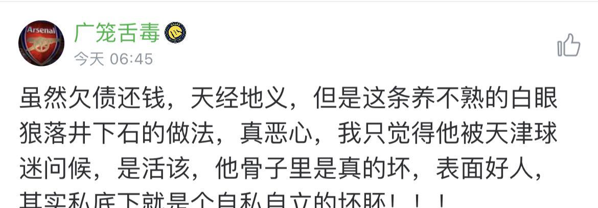 广州队的老总都亲自下场卖货筹钱还债了(还有各界、各地球迷的支援),他还逼宫,导致广州队就此解散,大家也因此一拍两散[无奈吐舌]导致其他人的欠债也还不了了。这头真的是白眼狼,此家伙真不可交[无奈吐舌][无奈吐舌][无奈吐舌]
