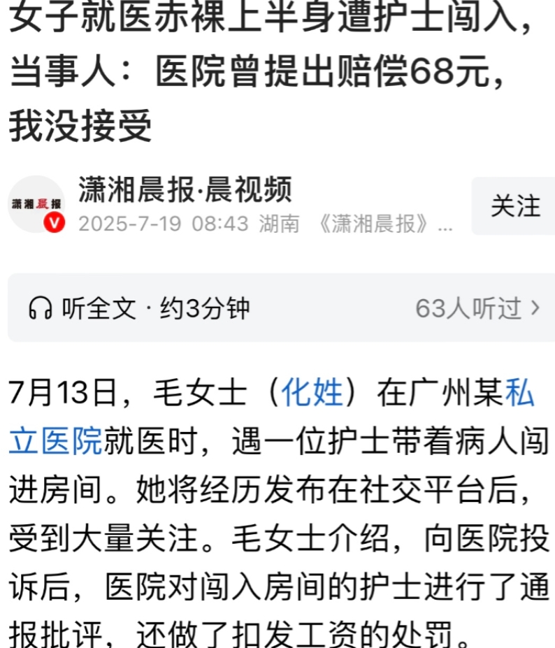 广州,毛女士在私立医院做心电图,上半身裸露时,护士带患者掀帘闯入,前台护士阻拦未果,闯入者看了一眼便离开。毛女士深感屈辱,事后护士简单道歉。7月14日医院通报批评护士和科室,却只愿赔偿68元,毛女士要求正式道歉信,事件未解决。医院管理有漏洞,患者隐私保护亟待加强,医院处理方式也欠妥,应该重视患者的合理诉求。