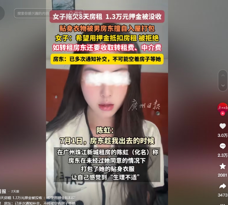 7月12日报道,广东广州,因女租客拖欠8天房租,男房东多次催要未果,扣了女租客1