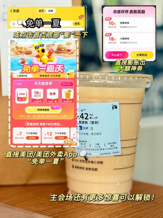 上美团/美团外卖App🔍“免单一夏”或点击首页底部“膨”一下,前往主会场还能发现更多惊喜!