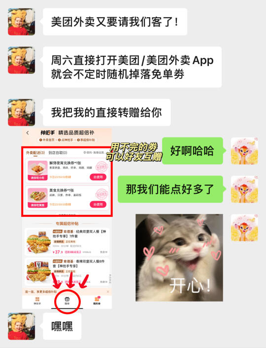 只需要周六打开美团/美团外卖App 就会不定时随机掉落免单券,用不完的劵还可以互赠,直接赠送给我哈哈哈连吃带拿!