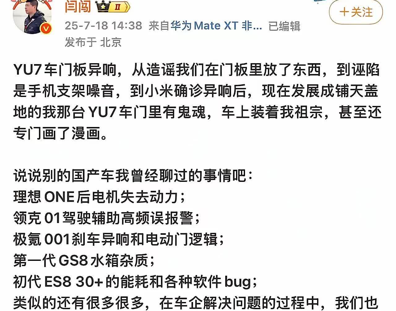 雷总,该管一管极端米粉们了! 这你敢想:7月16日,闫闯还在兴高采烈的和一众车圈大V,在小米用户中心试驾YU7;7月17日,闫闯仅仅因为称试驾时,发现小米YU7有车门异响情况,便遭到了极端米粉们的围攻,更甚者,直接搞起了人身攻击! 前些日子,陈震也是因为说了点YU7的缺点,就被极端粉骂的差点退网;现在是闫闯,以后呢?以后谁还敢提该品牌的缺点和不足! 车评人客观、真实的向公众反馈试驾车辆的问题,这不是一件再正常不过的事情吗? 作为涉事企业,理应该依据反馈积极查询、落实和整改,有则改之,无则加勉。 作为粉丝,应理性维护自己钟爱的品牌,而不是愚忠!恶意对他人进行毫无下限的人身攻击,那是在秀低智商,更是在犯罪!