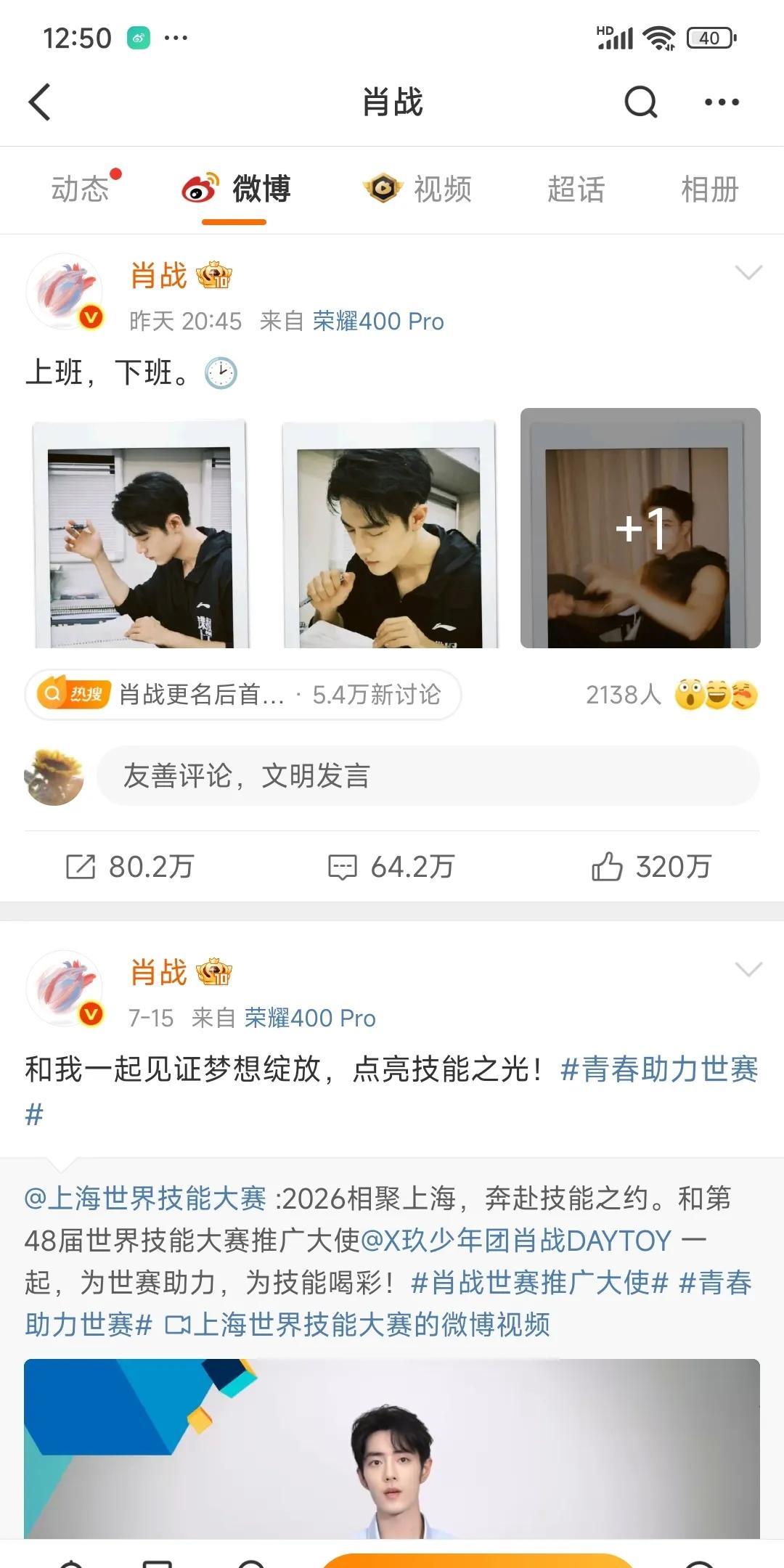 肖战更改名字后首发微博:上班,下班。 发的图片是,看剧本研究剧本的肖战。 点赞量320万。