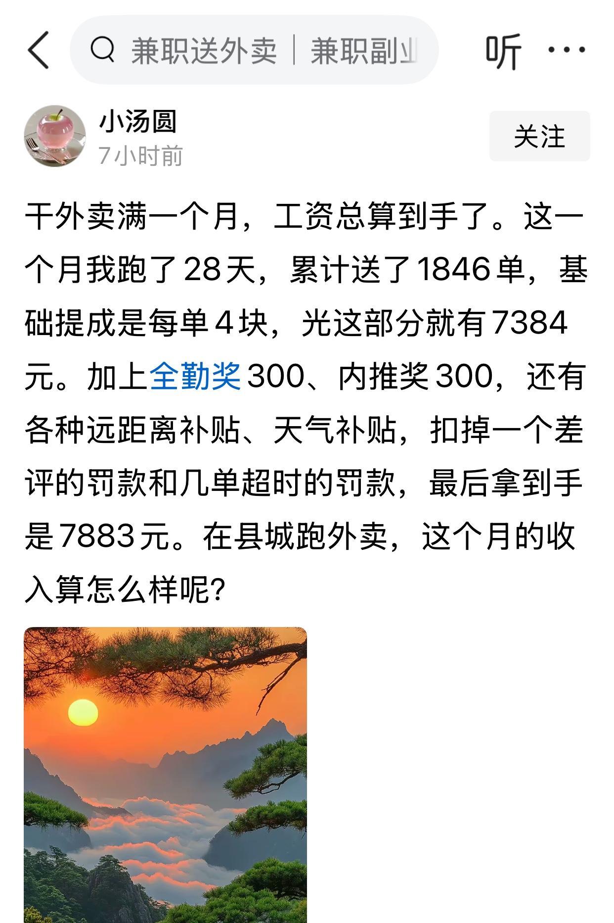 为什么那么多人都送外卖?是因为送外卖很赚钱吧?小县城送外卖一个月就可以挣七八千块钱,大城市送外卖一个月怎么也得上万元吧?起码没有什么压力,不用个人投资,挣的都是辛苦钱,只要愿意付出,就会有收获,而且还自由掌握时间,不想干就可以休息两天。