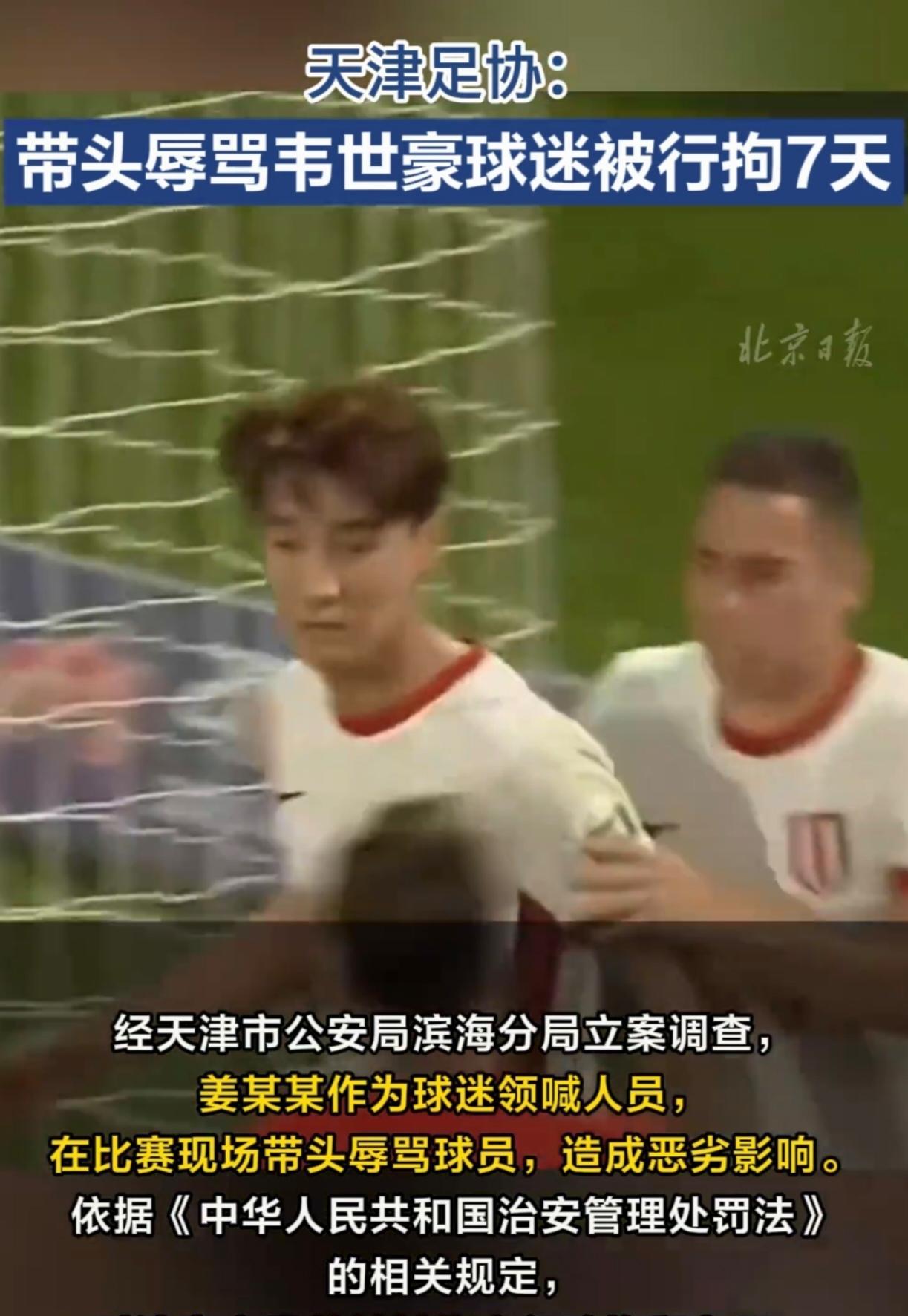 辱骂韦世豪的天津球迷被行政拘留7天,处罚不冤。 《治安管理处罚法》就有规定,在公