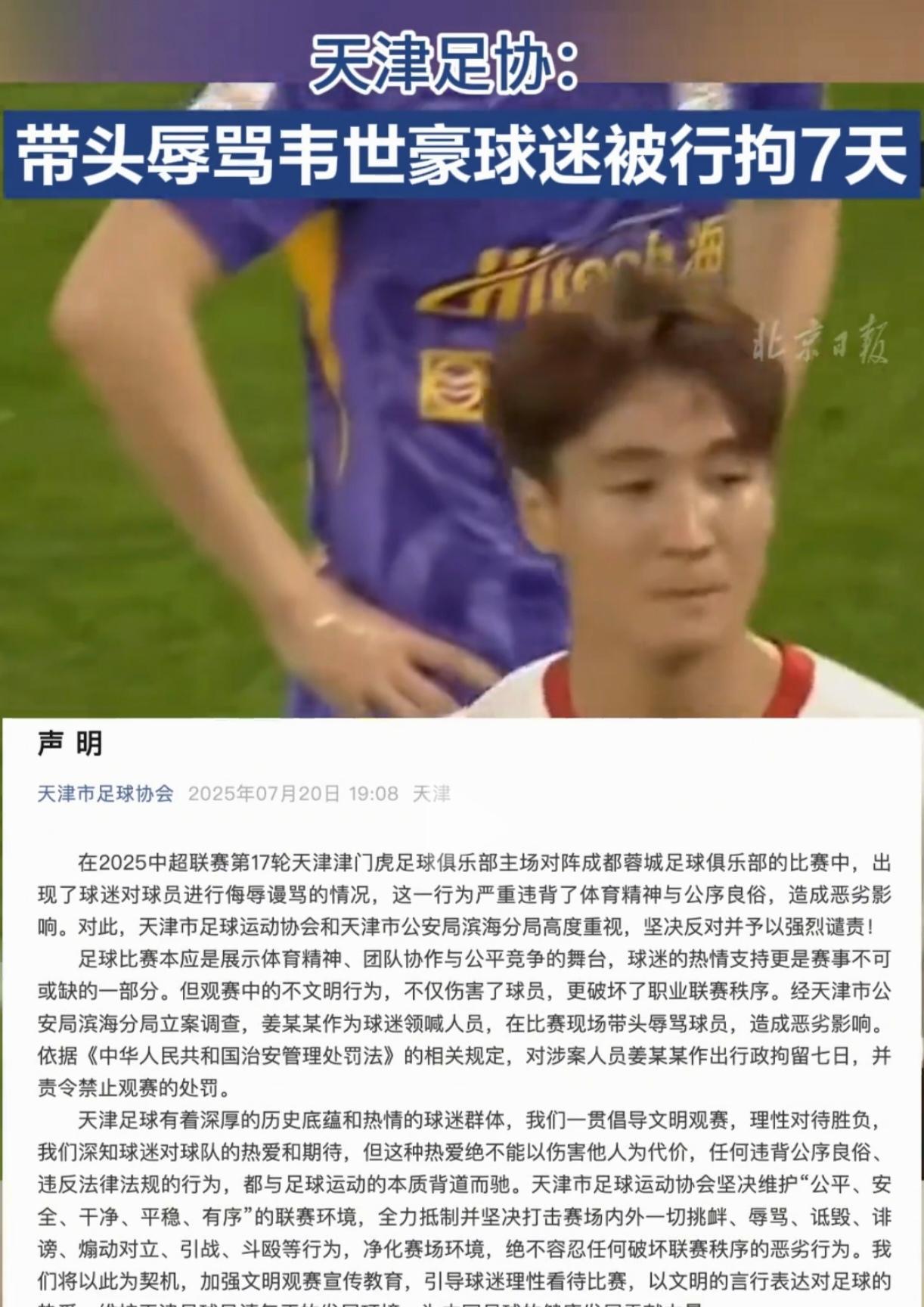 辱骂韦世豪的天津球迷被行政拘留7天,处罚不冤。 《治安管理处罚法》就有规定,在公共场合公然辱骂他人,情节严重的会处以5日以上10日以下的拘留。 反观天津球迷的行为,还是拿着大喇叭,估计球还没开始踢就已经准备好骂词了。 天津方面只拘留7天,禁止他观赛算是轻了。 而且这次处罚也是一次敲响警钟的行为,不然以后会有更多的球迷做出更疯狂的事,杀一儆百能起到震慑作用。