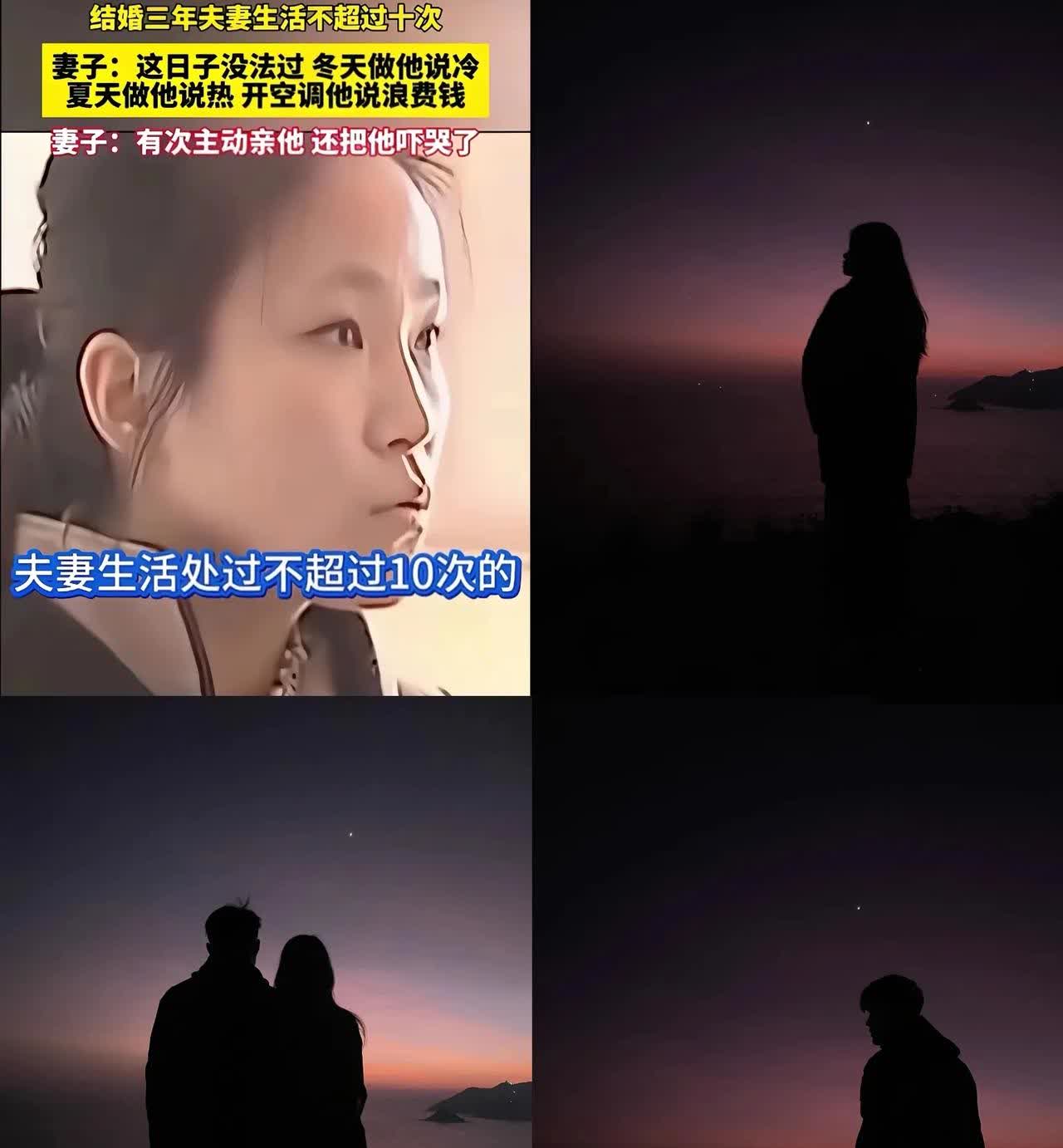 涝的涝死!旱的旱死! 一名女子在网上大吐苦水,女子声称:结婚三年,夫妻生活不超过十次,这生活没法过了! 两人通过媒人介绍相识,闪婚后感情曾较为甜蜜,但后来丈夫对夫妻生活很是抗拒! 三年来夫妻生活不超过十次,丈夫以冬天冷、夏天热、开空调浪费钱等为理由拒绝,小倪主动亲吻丈夫还曾把他吓哭! 经调解,丈夫小梁称是因小倪脾气太冲,自己怕被拒没脸面,久而久之才如此! 别觉得这是小事,身体的疏离从来都是感情的裂缝! 那些说“过日子靠亲情就行”的,怕是没搞懂! 亲密不是任务,是两个人在柴米油盐里还愿意靠近的证明! 他连这点温度都吝啬给,凭什么指望感情能抗住岁月磋磨? 真不是矫情!多少婚姻垮掉,不是因为出轨家暴,就是从“分房睡”“懒得碰”开始的! 你以为在忍,其实是在攒失望!感情这东西很实在,你不喂糖,它就会饿死! 要我说,与其纠结他冷不冷热不热,不如先问问自己:这样的“搭伙”,你还打算忍多久?毕竟好的婚姻,从来都少不了双向奔赴的热乎气! 你觉得,这样的婚姻还有救吗?要是你遇到这种情况,会怎么开口聊?