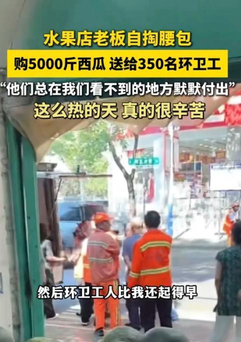 “这老板娘火了!”山西长治,一水果店女老板,一口气买了5000斤西瓜,转头全部分发给350位环卫工人。她说:“他们总在我们看不见的地方默默付出,这么热的天真的很辛苦!”网友:“最美女老板!” “大爷大妈们,来,吃西瓜,天气太热了,吃点西瓜解解暑,你们每天工作都辛苦了!” 在山西长治,水果店女老板一边热情地招呼着,一边将西瓜递到环卫工人手中。 7月19日,她自掏腰包购置了5000斤西瓜,专门拉到环卫站,亲手分给350位环卫工人。 这位女老板每日凌晨4点就要前往市场进货,漆黑的夜里,路灯下橙色的身影总是格外醒目,那是环卫工人在清扫街道。 扫地声与她搬货的声音交织,年复一年,这样的场景她已看过无数次,七月的骄阳似火,路面滚烫,她深知环卫工人的不易,便决定送上一份清凉。 当整车的西瓜抵达环卫站时,工人们起初有些拘谨,后来,大家脸上洋溢着笑容,接过西瓜,纷纷道谢。 有人疑惑,她为何要花这笔钱,她只是质朴地回应:“他们起早贪黑,工资又低,这么热的天,太辛苦了,我就想力所能及帮一把。” 消息在网上传开后,网友们纷纷点赞,称赞她是 “最美女老板”,认为她的善举展现了人与人之间的体谅与温暖。还有网友表示,要去她店里买水果,用行动支持这份爱心。 当然,也有极个别质疑的声音,但熟悉她的人都知道,她平时就常给工人送水,这次送西瓜绝不是作秀。 但不管怎么说,女老板确实让环卫工人感受到心灵的温暖,在这炎热夏日,她送出的不仅是西瓜,更是对劳动者的尊重与关爱。 “您这瓜甜,心更甜!” 一位环卫工擦着汗接过西瓜时的感慨,或许藏着另一种解读角度。 这位女老板和环卫工都是凌晨四点就忙碌的人,一个守着摊位生计,一个护着街道整洁,本质上都是用双手讨生活的劳动者。 她的举动跳出了 “施舍” 的框架,更像同行间的体恤,就像卖早点的给加班的护士多盛一勺汤,开便利店的给晚归的代驾留盏灯。 这种源于共同辛劳的理解,比单纯的善意更有穿透力,网友表示要去她店里买水果”,其实也是在用市井逻辑回应这份温暖:你对劳动者好,我们就对你的生计好。 城市里的劳动者常常像齿轮一样默默咬合运转,却很少有机会彼此道声辛苦。 这次送西瓜让大家看见那些重叠的忙碌身影里,藏着最朴素的共情,这种来自同一赛道的关怀,或许比宏大的赞美更能让平凡人觉得被真正懂得。