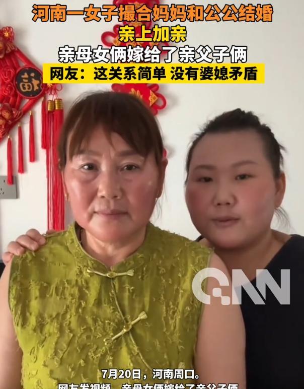 真是亲上加亲!河南周口,女子嫁个丈夫后,发现单身的公公人不错,而自己母亲也恰好是单身,就想着给两人撮合一下,没想到两人还真看对了眼,直接亲母女嫁给了亲父子俩,网友:婆媳矛盾不存在的! 女儿出嫁后发现自己公公一直一个人过日子,在丈夫出生不久的时候,婆婆就去世了,而公公性格也不差,干活又勤快,虽然岁数大点,身子骨倒是挺结实。左邻右舍也都夸这人厚道 而巧的是,这姑娘的妈妈也是单身,离婚后一个人过了不少年,日子平平淡淡,没想着再找,可心里多少也有点孤单 女儿和丈夫成了家,自己得照顾孩子,公公很多时候都要自己一个人打理家务。眼看着两个老人都单着,女儿心里有点过意不去 有天吃饭时女儿开了个玩笑,要不给我妈介绍个对象,结果一大家人你一言我一语,谁也没想到这“对象”就定在了自己家公公身上 原本就是随口一说,没想到公公还真有点动心,女儿的妈妈也觉得彼此都挺熟,都是一个圈子里的人,没什么见外的。俩老人聊着聊着,心思也就对上了。家里人其实都挺开明,没人反对,还都觉得挺好 有网友表示:这下亲家母真成了“亲家母”了 当然,有人可能会觉得别扭,但其实只要当事人愿意,外人也没什么好说的 换个角度看,幸福的家庭模式并没有标准答案,能让身边人过得自在、有人照顾,就是最实在的幸福 #女子撮合妈妈和公公结婚#