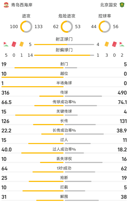第52分钟,国安打破僵局!何龙海回传出现严重失误,王子铭断球晃过李昊打空门得手。青岛西海岸0-1北京国安。