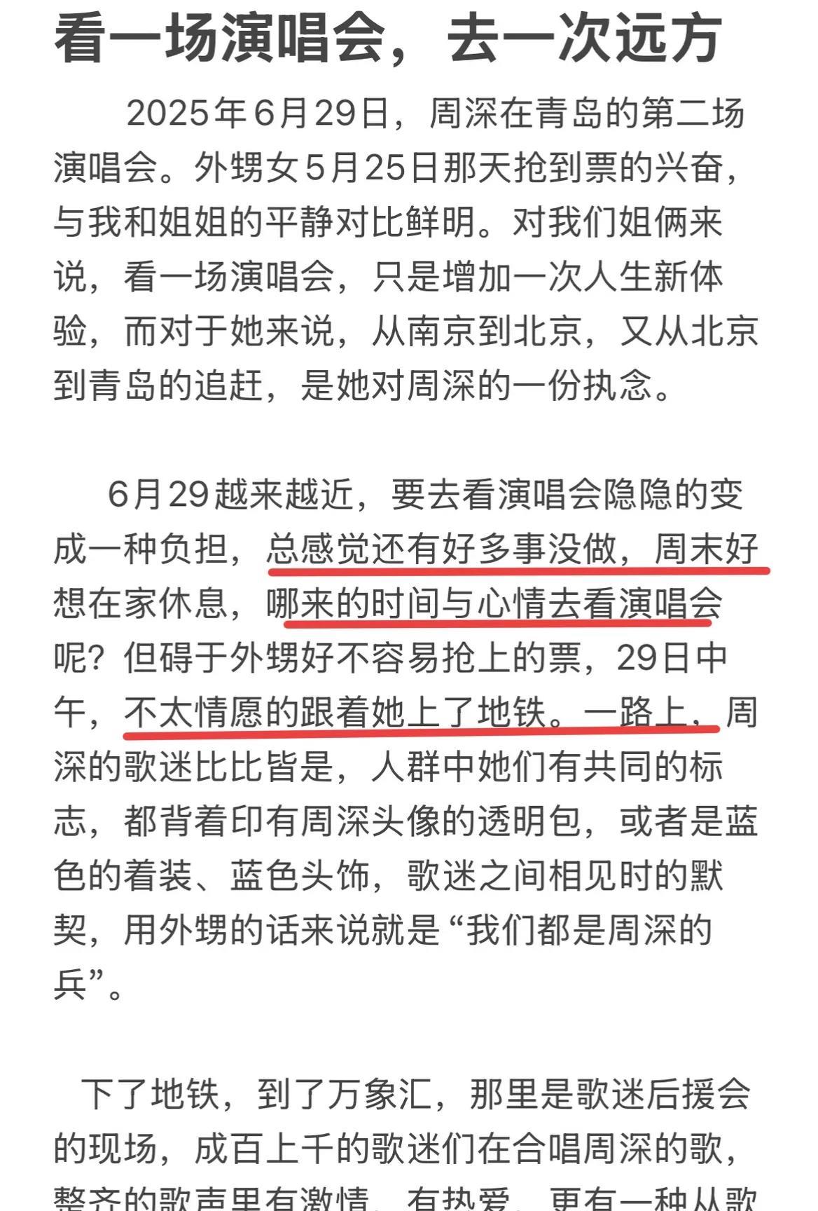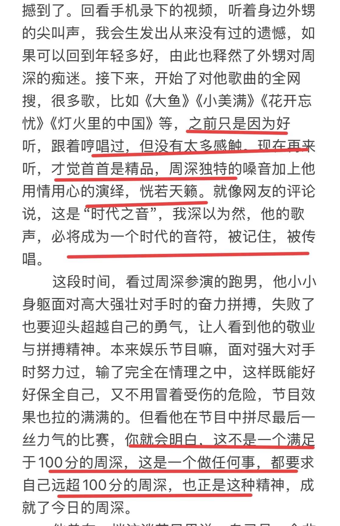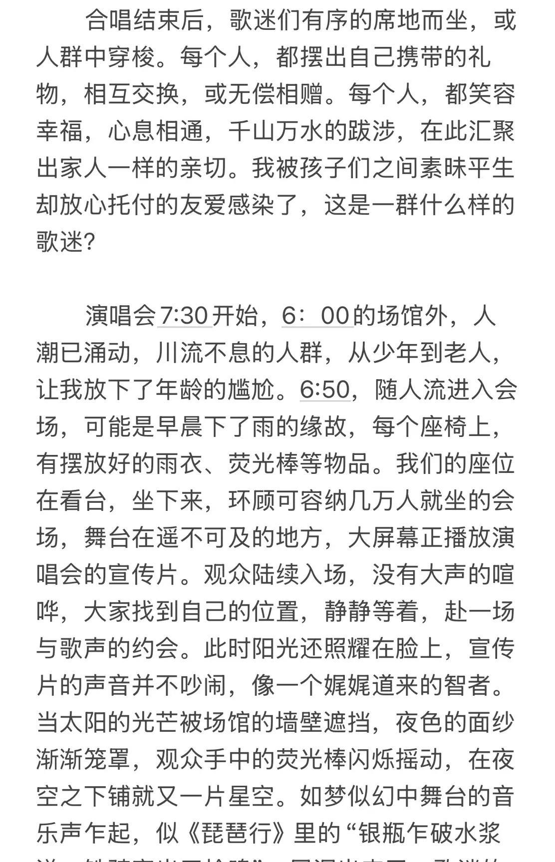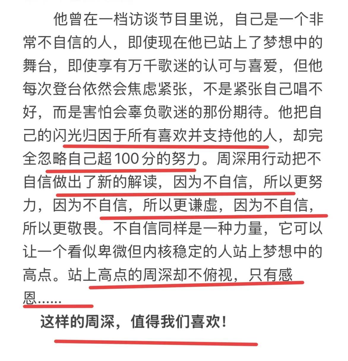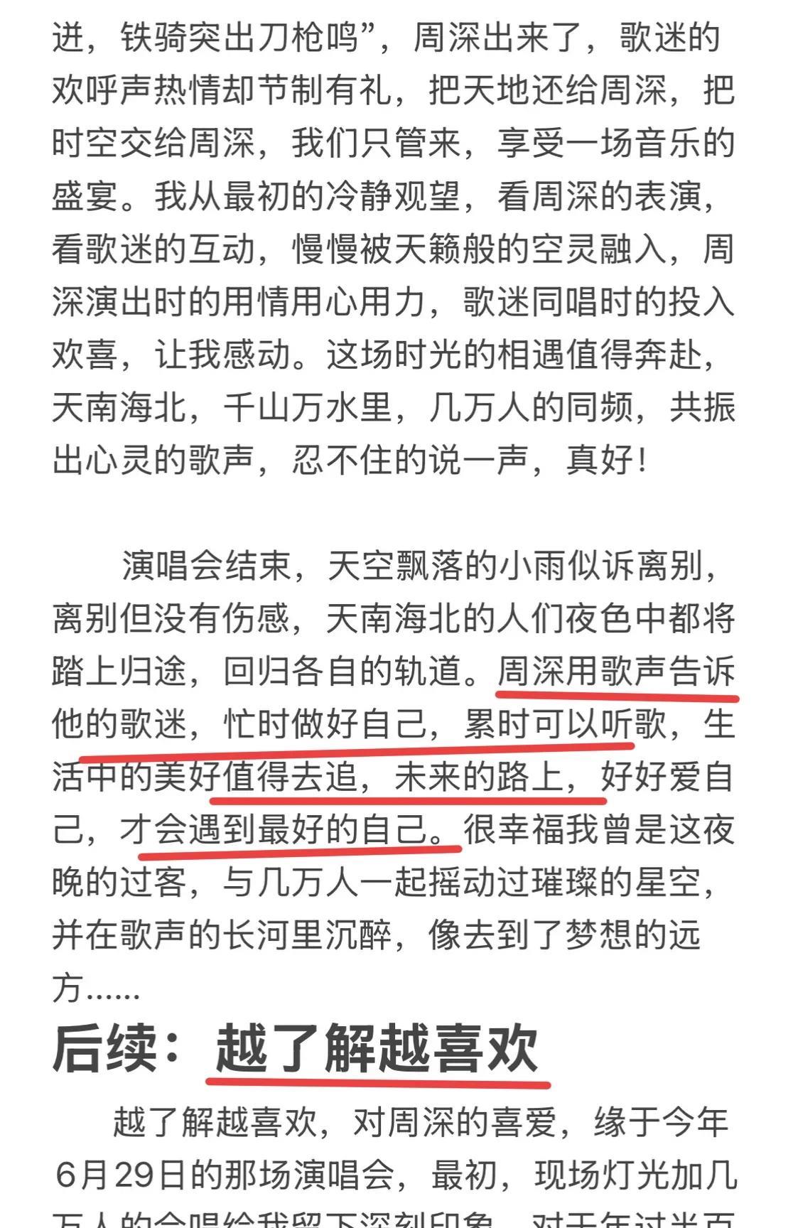 这样的周深,值得我们喜欢! 刷到一篇看完周深演唱会观后感的文章! 用心又细腻的文字,完全看得出来作者从不理解到越了解越喜欢的心态变化,也可以从文字里能感觉到小姨肯定也是很感性很温柔的人! 真好啊!周深值得!#周深演唱会# #周深#