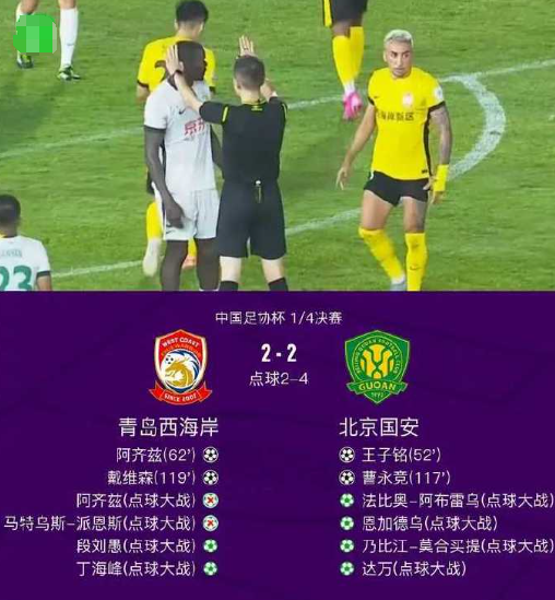 北京时间7月22日中国足协杯 1/4决赛,青岛西海岸对阵北京国安。青岛西海岸阿齐兹破门,戴维森破门。北京国安王子铭破门,曹永竞破门。最终比分青岛西海岸 4-6 北京国安。