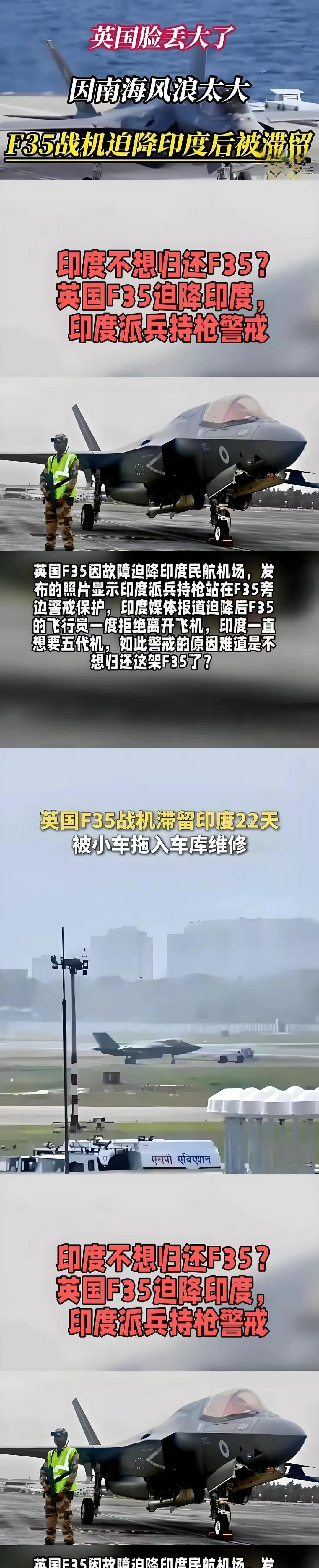 英方的F-35B战机终于修好了,起飞了,离开了印度,这一消息已经得到了印度官员的证实。 对于这架F-35B来说,2025年6月14日是个极不幸的日子,当天英海军“威尔士亲王”号航母搭载的一架F-35B战机在印度南部喀拉拉邦海岸约100海里处飞行时遭遇恶劣天气。 因燃油不足,被迫紧急降落在印度南部的特里凡得琅国际机场,然而更不幸的是这架飞机的飞行员被极其热情的印度人给吓到了。 印度怎么也想不到梦寐以求F35竟然就在眼前,本着雁过拔毛的行事原则,立即安排专家,要对F35进行大修。 但英飞行员却不同意,要知道F35可是美英等西方国家的主力战机,美配备了大约671架之多,而英配备了38架,还有一架已坠毁! 这种战机根本就没对印度出口过,一旦泄密,后果不堪设想,所以英飞行员就拿着把椅子,寸步不离的守护在这架F35跟前,整整11天。 不得不说,这名英飞行员是合格的,并且负责任,唯一不足的一点,是他停错了地方, 直到7月6日,一支由英国空军专家和机组人员组成的25人团队带着修复设备专程赶到,才将其修好。 7月22日上午,这架F-35B战斗机成功起飞,将飞往澳大利亚达尔文海域与英国航母会合。 这架战机在印期间,差一点引发英印的外交大战,足可以写一本F35历险记,现在F35的机密具体被印学了多少,解密了多少还不得而知。 不过有一点可以肯定,英F35除了要向印交停机费之外,还需支付额外的维修设备和专业服务费,并且可能涉及外交协调和物流支持费。 这些加在一起可不是笔小费用,学不到技术,收点费总是可以的吧! #F-35战机# #f35 战斗机#