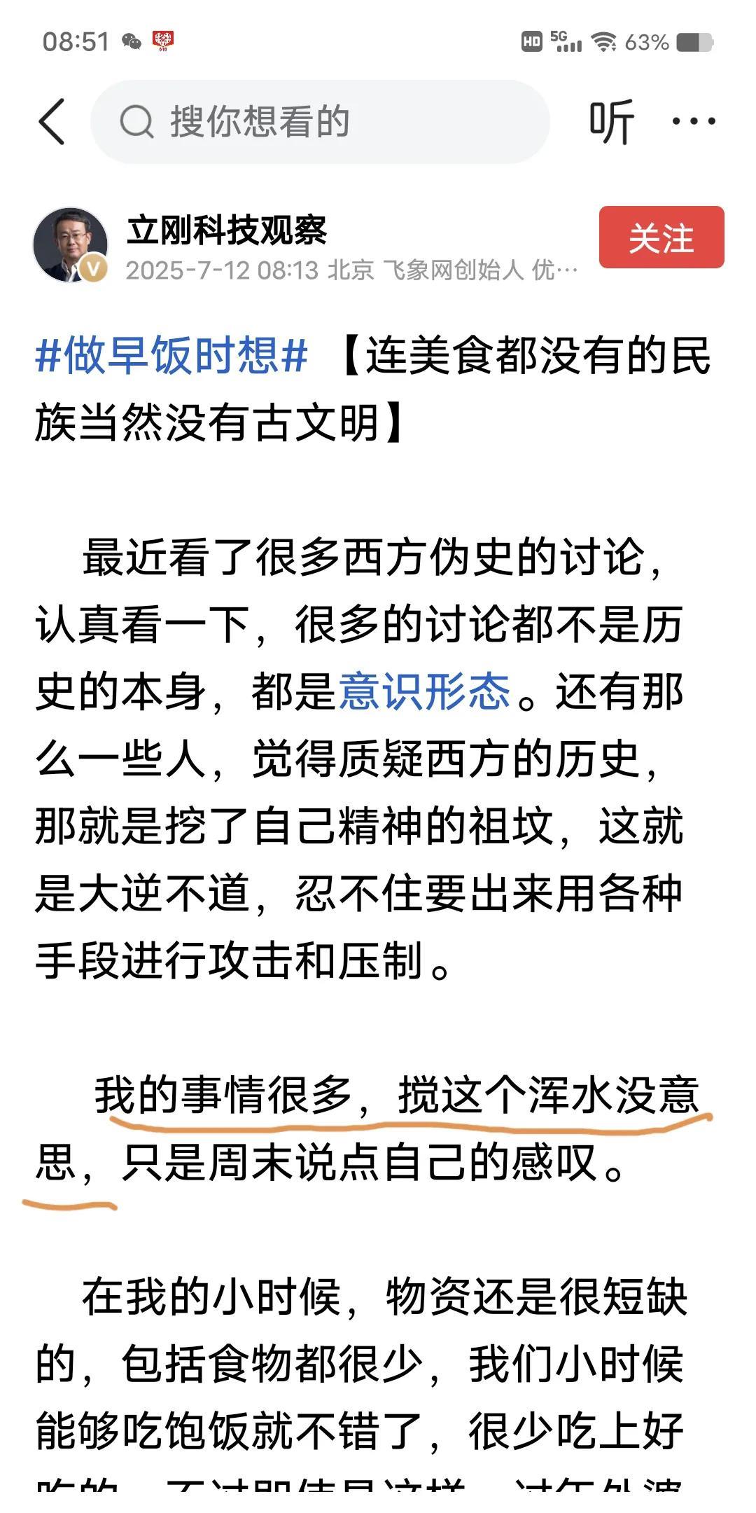 项立刚总以自己在通讯行业的远见卓识而自豪,说自己能比别人看先一步。但是在参与西方伪史论这个话题上,却大大的滞后了。伪史论已经热闹了好几年,这都快收尾了,项先生才加入进来。 项先生不是这方面的专家,明显不了解西方古典文明史。看到西方伪史论什么奇葩言论都可以有,这就好下笔了,不妨一试。他就先从“美食”立论,这个无需西方古代历史知识。 “连美食都没有的民族当然没有古文明”。“昨天说吃都不会吃,哪里会有古文明,我觉得这是常识”。 虽然用“吃”来否定一个民族的古文明有点草率,但依靠项先生已有的“v”力,流量还是让项先生满意的,在第二篇文章开头就说“很意外的是大家反响很大”。那就顺水推舟,再接再厉。 第一篇项先生确实心里没底,太勉强。所以在文章一开始先声明:“我事情很多,搅这个浑水没意思”。可是流量让项先生放下了别的事情开始搅浑水了,也越来越觉得有意思。这不,隔三差五就写一篇伪史论。 遗憾的是,没有西方古典史做基础,心里就没个准稿子,写的就有点乱。一会儿用吃否定掉西方的古文明。一会儿又说“古埃及、古希腊的文明,我们不能认为没有这种文明的存在”。那西方古文明到底有还是没有呢?无所谓,参与最重要。 有一篇文章的标题是“政权可被推翻文明不可能被终止”。可写着写着就写出了“一些文明会随着外族入侵造成整个文明的消亡,甚至湮灭”。 那到底文明可不可能因为政权被推翻而被终止呢?无所谓,参与最重要。 项先生一直是以爱国人设立于网上,他认为一切反西方的都是爱国行为。殊不知西方伪史论已经被官方批判了。人民日报发过文章批,中国青年报发过文章批,上海电视台做过节目批,各大平台还封了一批伪史论账号。在这种形势下你跳出来为伪史论站台,这是和谁作对? 项先生在通讯领域高瞻远瞩,而在政治领域鼠目寸光。