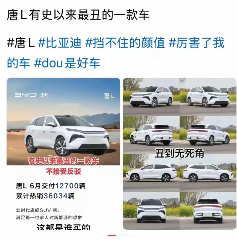 比亚迪唐L被骂得真的惨,有史以来最丑的一台车,我觉着龙颜大怒的设计不错呀。空有一身武艺(兆瓦闪充)没有用武之地!还有一个问题就是价格过高。比亚迪也不是黑你。唐L产品经理在回过头来看看定价,现在深蓝s09的价格,领克900的价格,乐道L90不带电池的价格,还有零跑D19(初曝光)的价格。 唐L赢在哪里了?