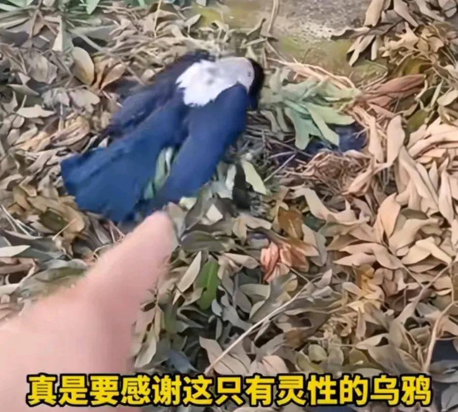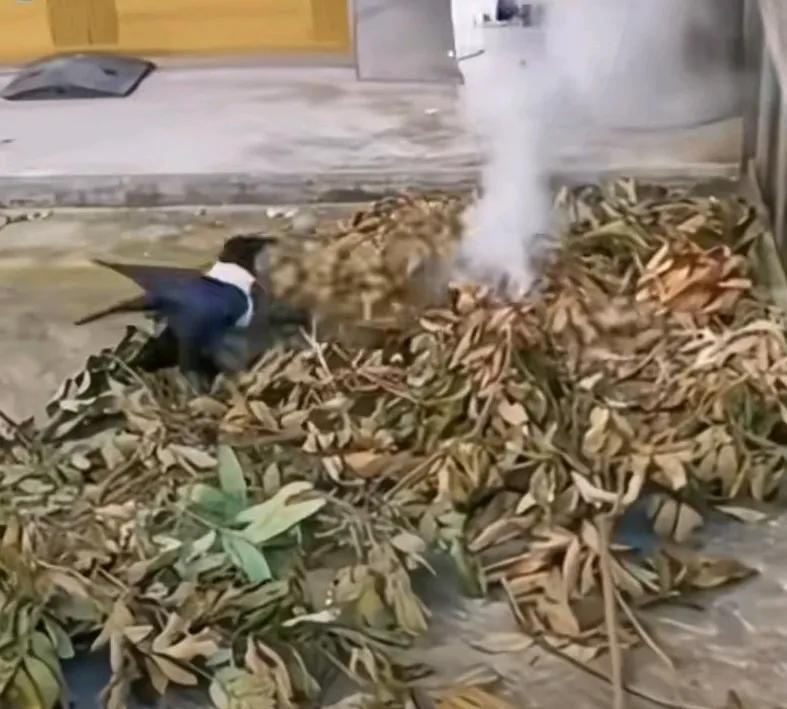 这只乌鸦正在帮忙熄灭院子里的干草起火了,真的太不可思议了,我真的要谢谢它!