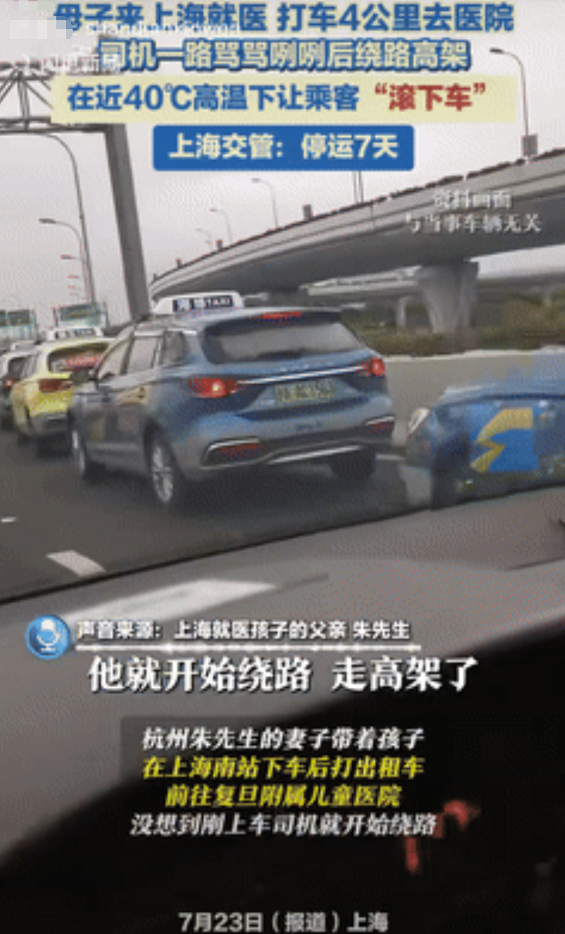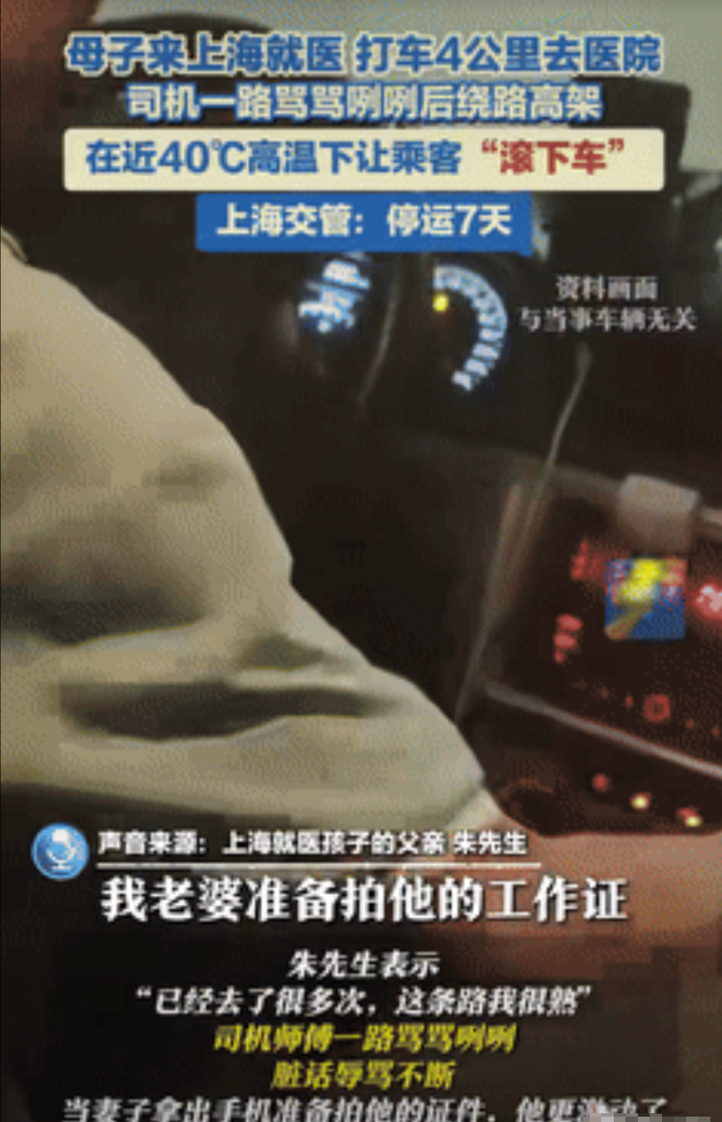 “严惩不贷!”上海,一女子带孩子来上海就医,出站后打了辆出租车,前往医院,谁料,刚上车司机就借着熟悉路段的理由,疯狂绕路,被拆穿后一直骂骂咧咧,最后在将近40度的高温下,把母子俩扔在半路,接下来女子的做法让人解气。 据闪电新闻7月23日报道,一开始司机的服务态度就不好,女子没有理他,而且打车到医院也只有4公里的路程,但是司机一直表示,这路他很熟悉,所以一直带着母子俩绕路,女子感觉不对劲,便向司机提出质疑,司机察觉被发现时,演都不演了,一路上脏话辱骂不断。 当女子拿出手机想将他的证件拍下来时,司机直接让母子俩“滚下车”,就这样,母子俩在38度的高温下,被司机甩在了半路。 女子的丈夫知道后直接将司机投诉,给出的处理是将司机停运7天,如果再敢犯,就实行劝退处理。 不得不说司机的做法确实让人费解,乘客到你车上来也是一种信任,实在不理解司机这么做的道理,难道就是仗着自己是本地的欺负外地的吗? 对于这件事情,很多人网友也发表自己的言论,有网友气愤的说:停运七天?太轻了吧,应该取消运营资格。还有网友表示自己也有类似的遭遇:我们前两年在上海遇到同样的情况,差不多也是四五里路,司机上来就开始发牢骚,骂骂咧咧的。 对此,大家怎么看?