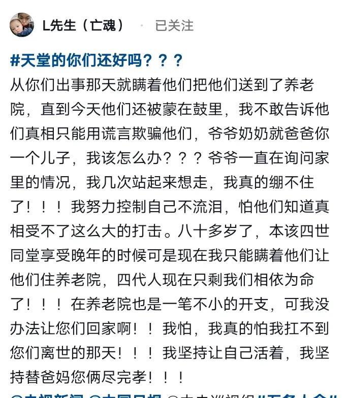 还记得6月22日河北邢台被mie门的公婆儿媳和两个孙子吗?就因为盖房子和邻居一个通道问题,邻居就在早晨四点把公公骗出去杀害,然后进门又杀了婆婆儿媳孙子四人。 现在杀人凶手已经被警方逮捕,可是活着的人还在煎熬。 这家唯一的幸存者,“L先生”发视频 ,从父母出事,为了瞒住爷爷奶奶就把他们送进养老院,养老院的费用对他也是一笔不小的费用。 在父母妻儿去世一个月的7月22号,他来养老院看爷爷奶奶,老人还不知道唯一的儿子一家的惨剧,可是从爷爷奶奶焦虑的表情中,或许他们已经有了不好的感觉,只是听着孙子编的谎话,还在半信半疑中。 不敢想象这对老人知道真相以后的伤痛,也不知道法律除了判杀人者死刑,赔付死者丧葬费,还能为受害者家属做什么?