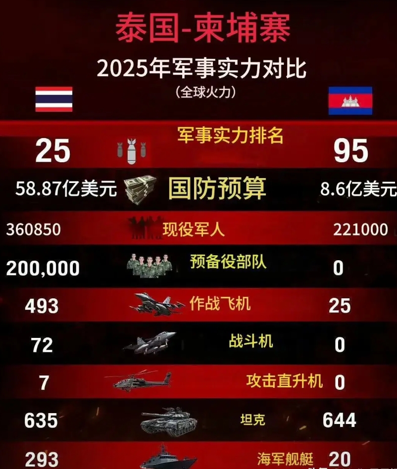 就目前泰柬都没有后援的情况下看,泰国海陆空、兵器、兵力多方面都占有明显优势!