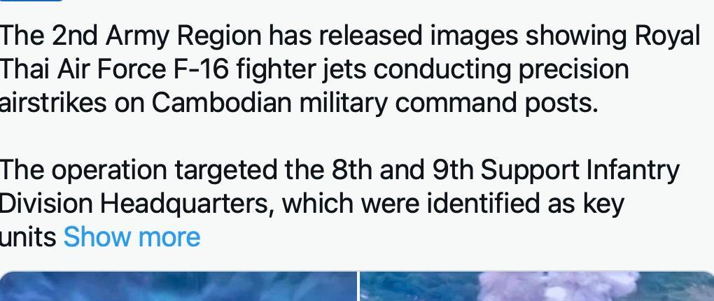 【传美国点头,F-16精准轰炸柬埔寨,炸弹上写着“洪森,你好”】 在这场柬泰冲突中,曼谷方面出动F-16,猛炸柬军目标。一张的图片显示,战机所搭载的炸弹上明确写有“洪森,你好(Hello Hun Sen)”几个字。毫无疑问,侮辱性很大。#是谁在推动泰柬局势升级# 而泰国陆军中还发布了据称是“F-16精准打击柬军指挥所”的视频影像。#两大司令部被炸毁 柬军败局已定了吗# 有外界分析称,以曼谷和华府过去的同盟关系看,这泰军出动F-16展开攻击行动是在后者的点头允许下所进行的。不过特朗普本人至今还未对这场冲突做任何明确表态,也不确定美国接下来的立场究竟会是什么?#泰代总理:泰柬边境冲突或升级为战争# 泰国国内还盛传,这次泰军首度在战斗中部署了此前从乌克兰采购的T-84“堡垒”主力坦克,它们主要负责攻击冲突线附近的柬军的军事基地。一位泰国军事博主在网上发文证实:“堡垒”装甲部队已参战,它们部署到争议地区,并向敌军开火。#泰方出动F-16摧毁柬方两处军事设施# 而柬军方面则部署了东欧国家制造的多管火箭炮,试图对泰军阵地进行火力压制。从目前的情况看,两国冲突似乎正越打越大。#泰柬发生全面军事冲突的概率大吗#